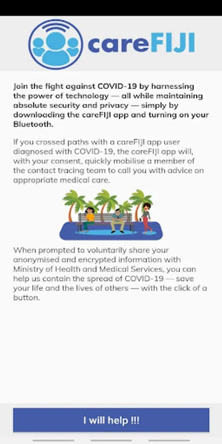 careFIJI is a mobile application developed by the Fijian Government under the digitalFIJI initiative to assist the Ministry of Health and Medical Services streamline and speed up its manual contact tracing efforts. By opting into this voluntary initiative, Fijians can help stop the spread of COVID-19 and save lives by harnessing the power of technology – all while maintaining their absolute security and privacy. Using Bluetooth technology that does not capture any location or GPS information, careFIJI is based on the open source reference implementation of TraceTogether mobile application developed by the Singaporean Government.