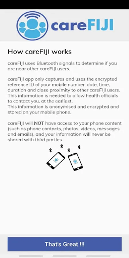 careFIJI uses Bluetooth signals to determine if you are near other careFIJI users. This close contact data is anonymised, encrypted and stored on your mobile phones.
