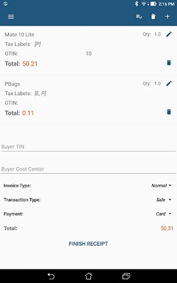 The app supports, Normal, Copy, Training and Pro-forma invoices in both Business-to-Customers and Business-to-Business type of transactions. For B2B transactions Buyer’s Tax Identification number can be inserted during invoice creation