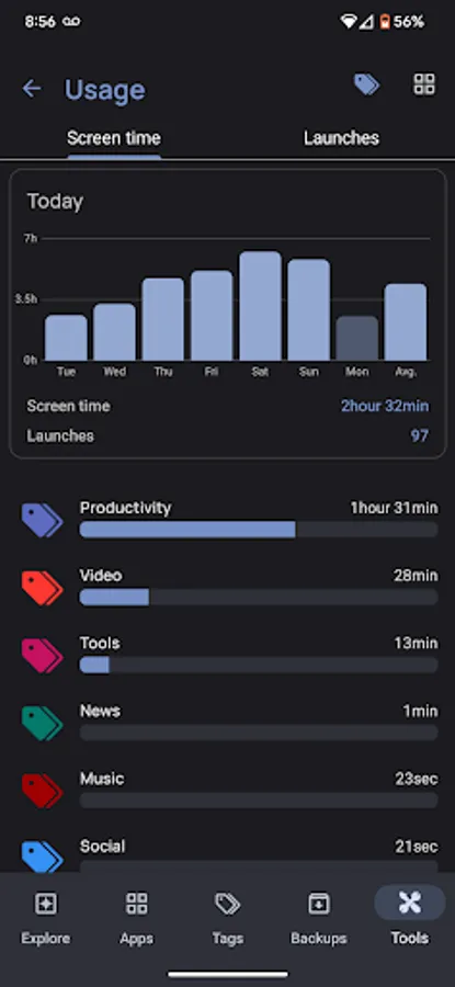 Get details about screen time and number of launches. By default, a weekly average is shown. Tap on the bar graph to show details for each day. You may show usage details for individual apps, or aggregated usage by tag.