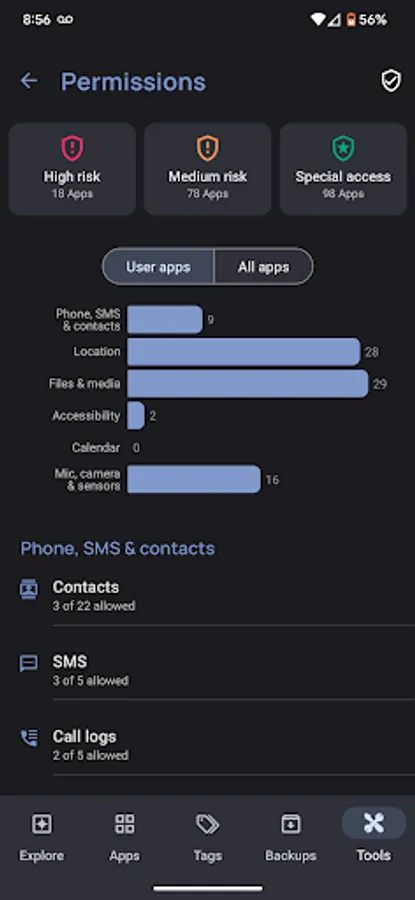 Detailed permissions manager and aggregate permissions summary , including lists of high and medium risk apps and apps with special access.
