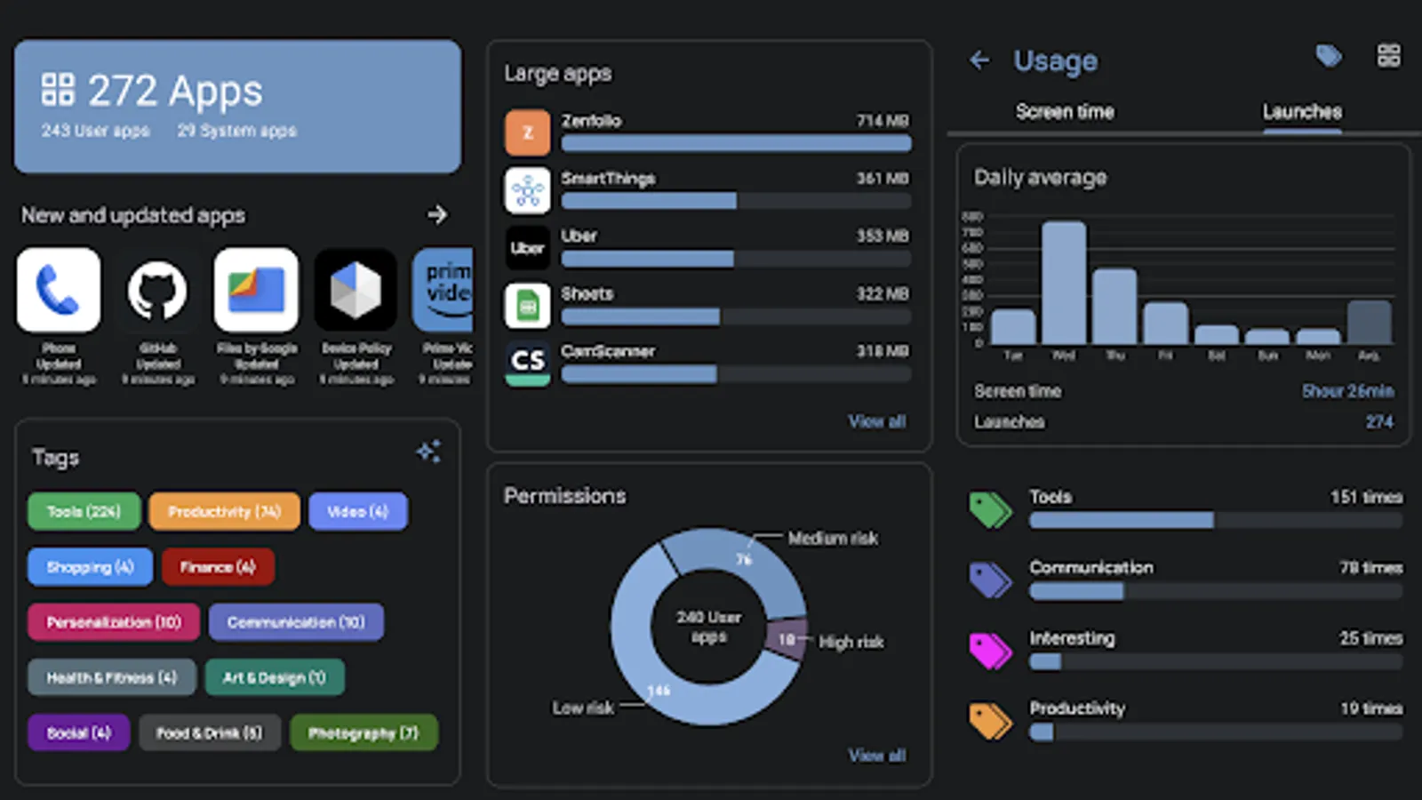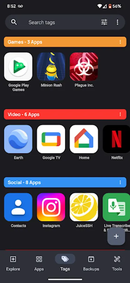 A great way to organize and visualize your apps. You can create up to 50 customizable tag groups and easily add or remove apps. Perform batch actions, such as backup and restore, or create sharable lists of apps. You can even view app usage summaries by tag. Use the autotag feature to categorize your apps automatically.