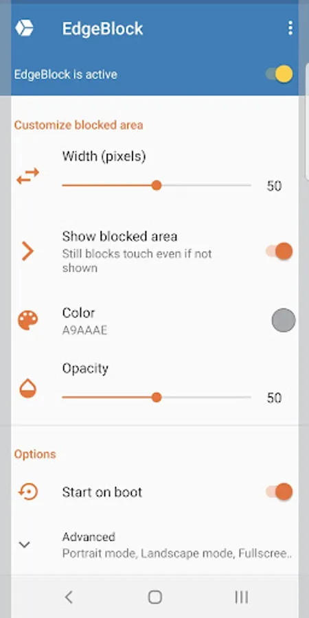 The touch-protected area is adjustable and can be made invisible or any color you like! Adjust the color, opacity and width of the blocked area and specify which edges should be blocked. You can set which edges are blocked separately for portrait, landscape and fullscreen modes.