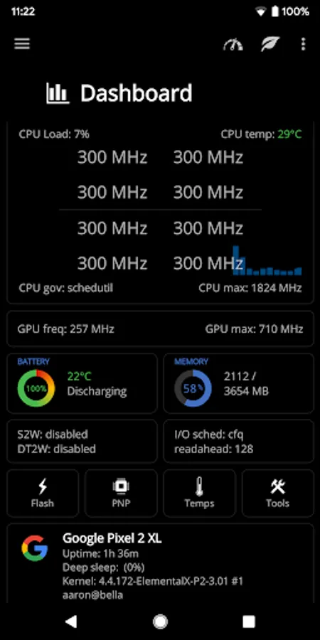 Dashboard: your homepage within the app, Dashboard summarizes your current settings and shows real-time CPU and GPU frequencies, temperatures, memory usage, uptime, deep sleep, battery level and temperature, governors, and i/o settings.