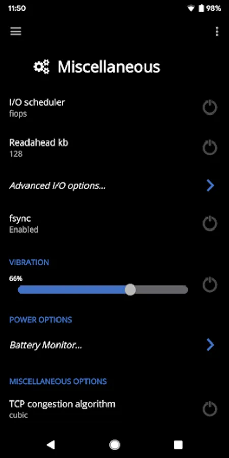 Custom User Settings: This feature allows you to add any kernel setting you want. Kernel settings are located in the /proc and /sys directories. Navigate to the desired path and quickly and easily add the setting to the app where it can be changed on the fly or applied at boot. Plus you can easily import/export your custom settings and share with other users.