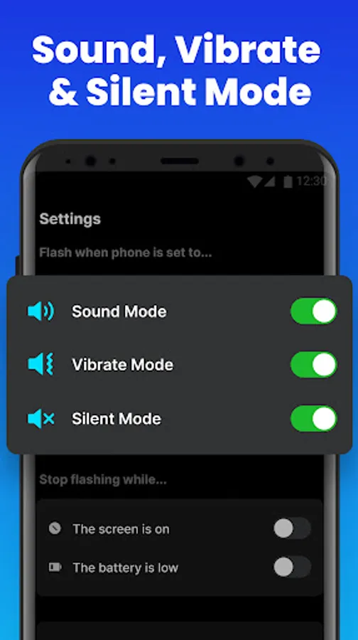 π Set flash alert for different phone ringtone modes: sound, vibrate, silent.