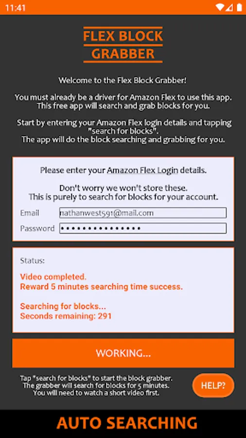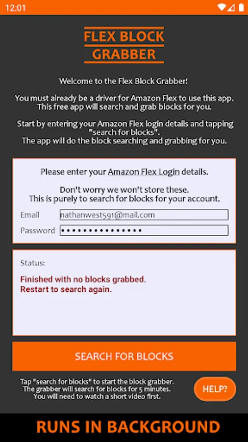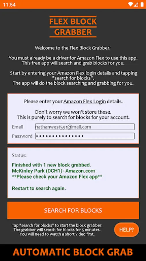 Simply enter your Amazon Flex login and tap "search for blocks". The app will then search for blocks in your account and grab any blocks that come available.