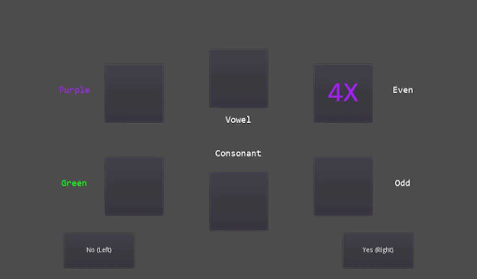 This game is inspired by other task-switching and response inhibition training games. The player is presented with a colored letter + number sequence, like "A2" in yellow, which appears in one of six boxes on the screen. These boxes each represent one of the six rules; odd, even, consonant, vowel, color 1 or color 2.