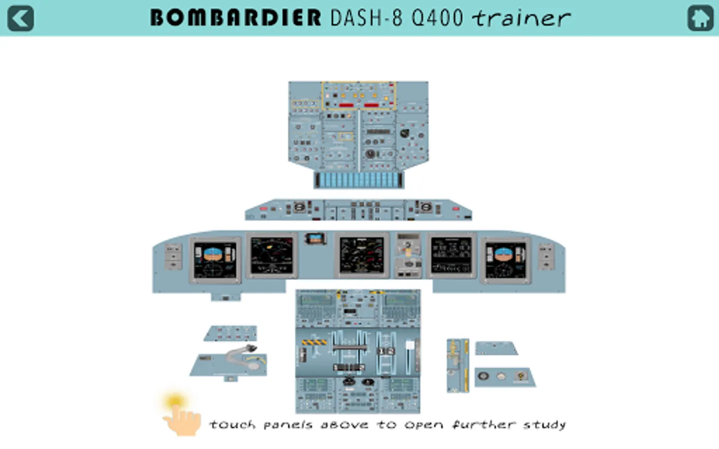 This is an application for cadets and pilots flying the Bombardier Dash-8 Q400 aircraft. It presents the whole cockpit for you with clickable panels and screens for further in depth study of each system and button including display screens like the PFD, NAV display, ED and MFD.