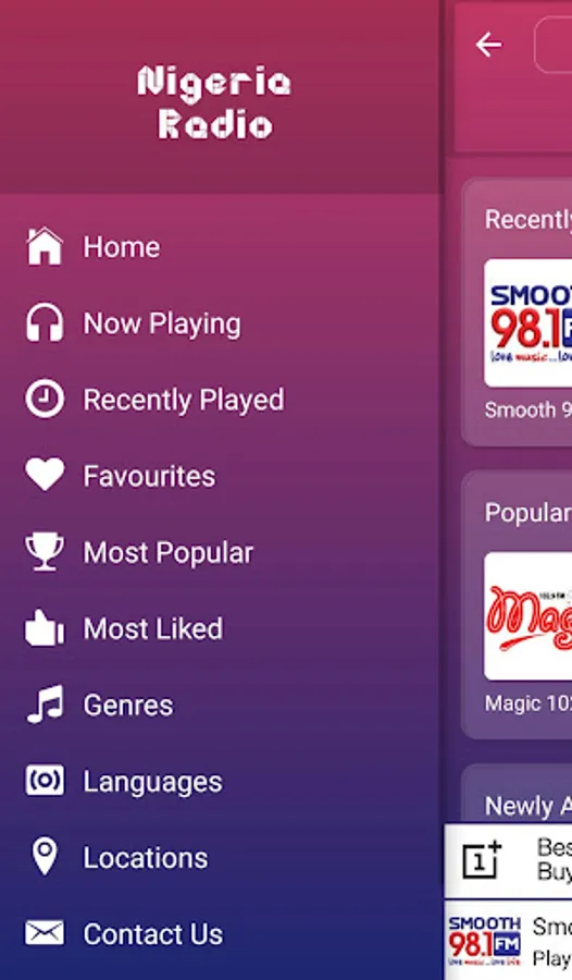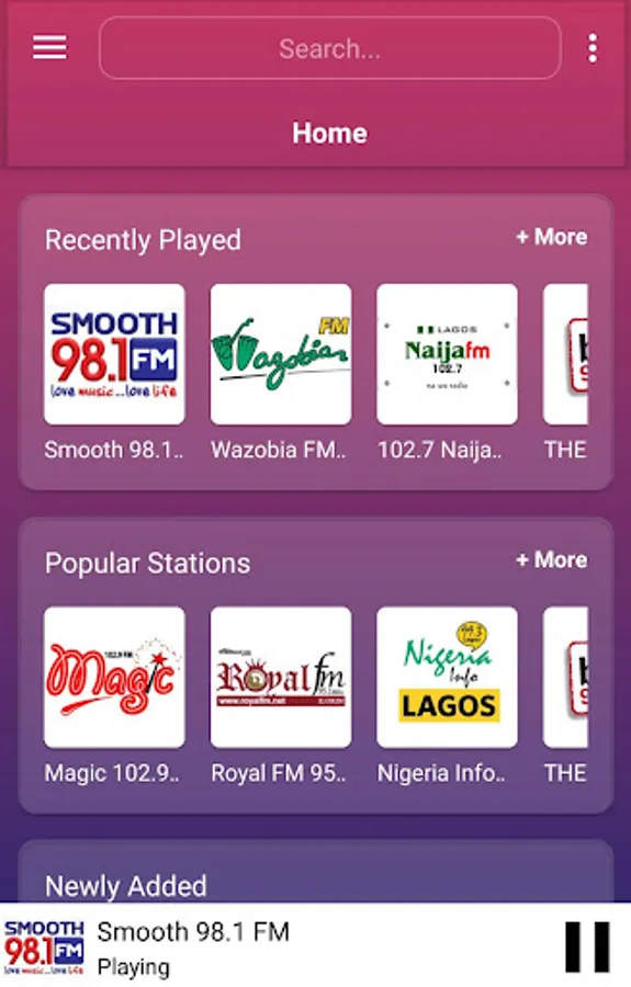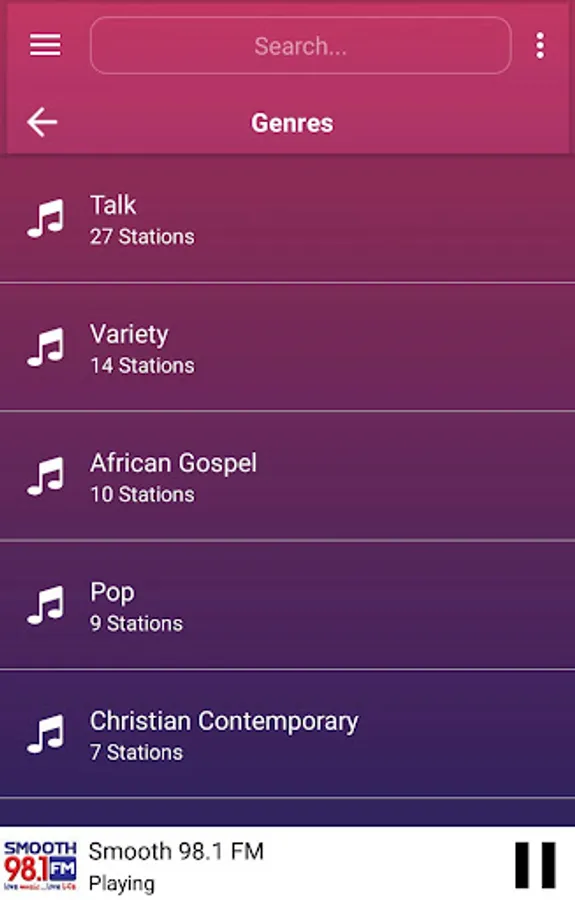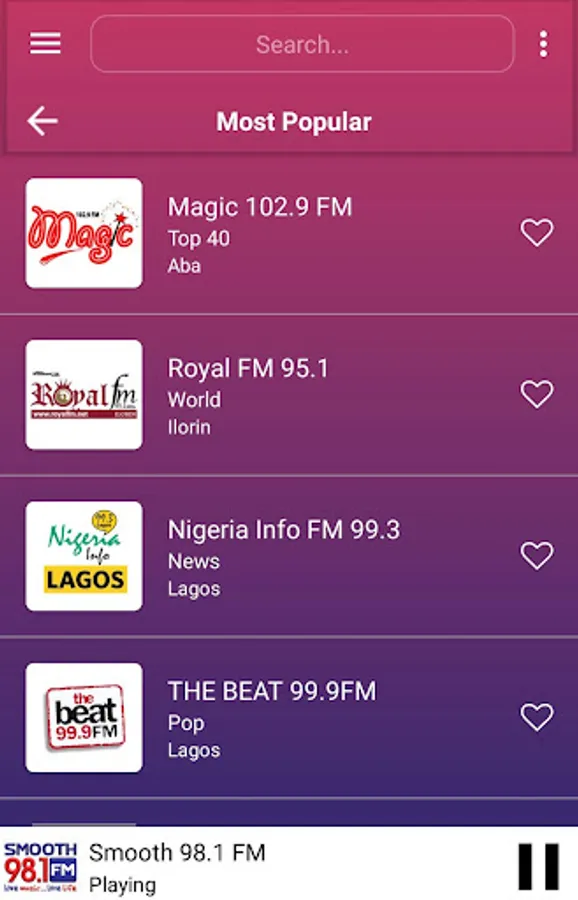 The best collection of online radios and FM radios from Nigeria. More than 50 radio stations from Nigeria. This app is loaded with favourites list, 6 color themes, alarm, sleep timer to auto shutdown FM after a time, sharing with friends, in-built volume control, background playing, retaining last played station on start.