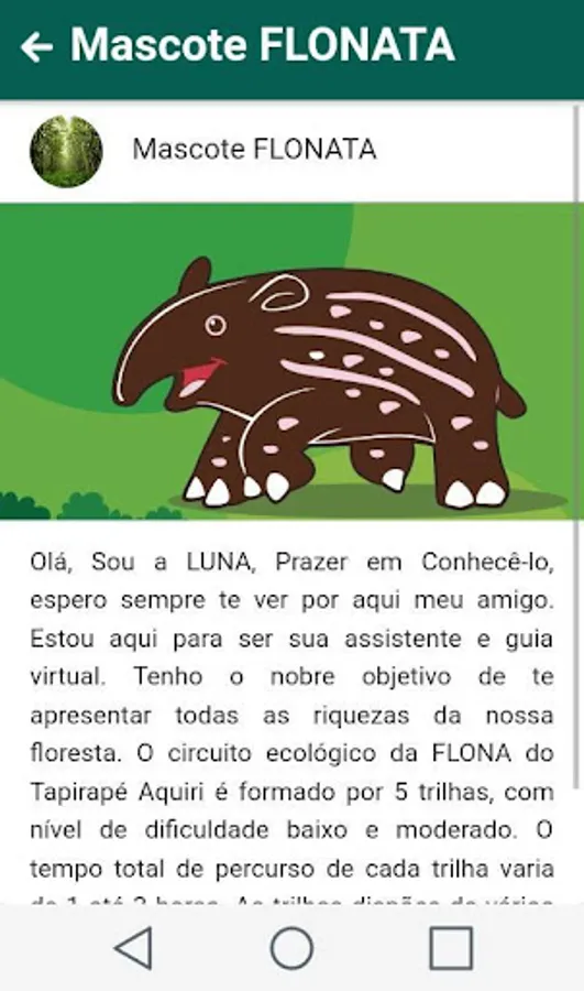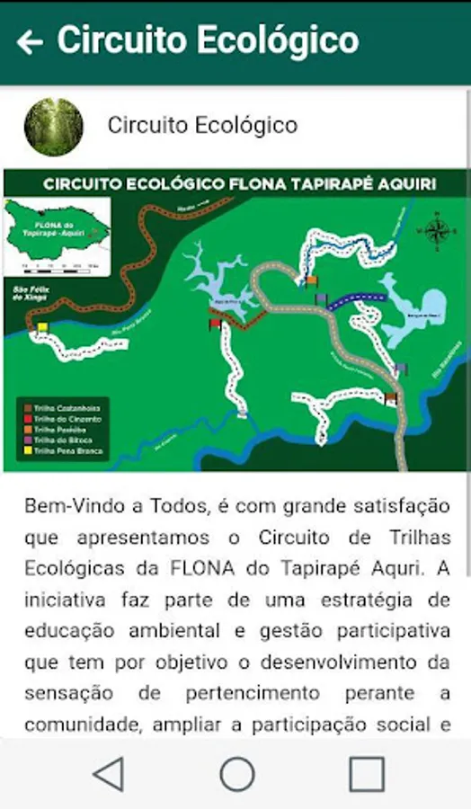 The purpose of the App is to enhance interaction with nature and enrich environmental education activities in the Tapirapé Aquiri FLONA ecological trail circuit. The initiative is part of the Community Goes to the Forest Program, which aims to promote guided visits to the interior of the CU within the perspective of Critical Environmental Education. The visits are guided by the volunteer staff of FLONA, who undergo a rich training process on the ecological, socioenvironmental and historical aspects of the protected area and its regional context.