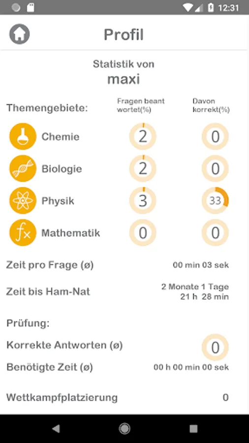 Based on your personal statistics you see your average time of answered questions and your learning progress in the various examination subjects.