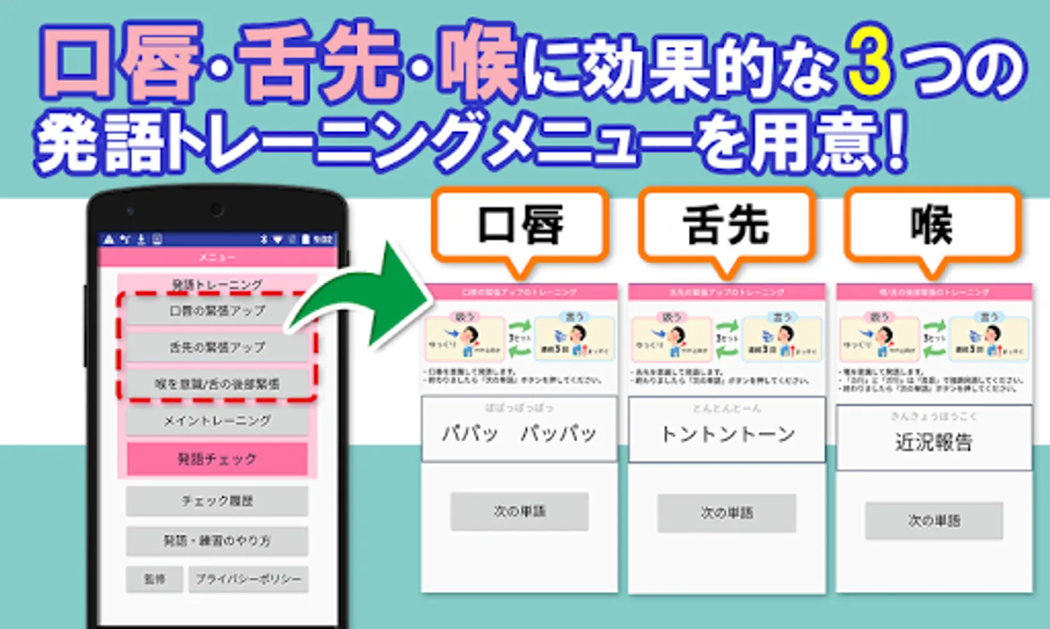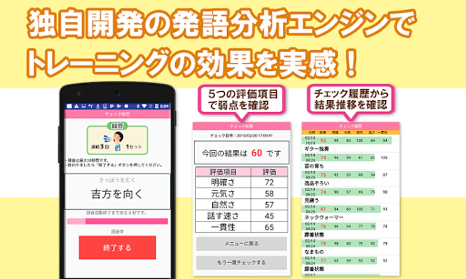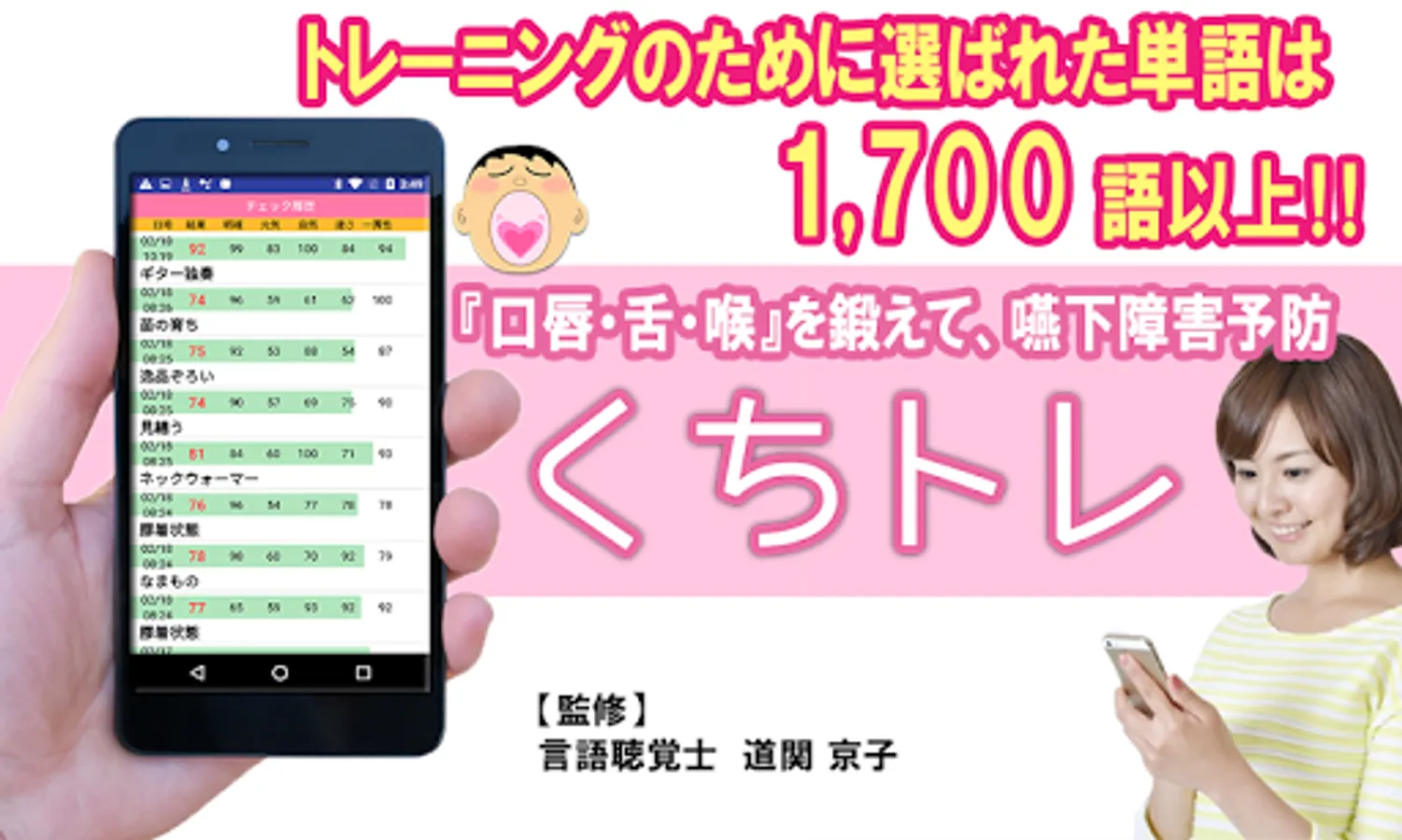 The "Kuchi-Tre" app trains the "mouth, tongue, and throat" speech organs by repeating "speaking" training by repeating over 1,700 difficult-to-speak words and Pataka words, improving the smooth tongue, and smooth swallowing. Is a tool for.
