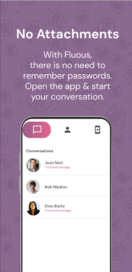 With Fluous, there is no need to remember passwords. Open the app & start your conversation. No registration & login is required. Just enter your nickname and off you go.