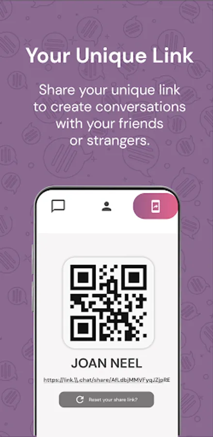 Share your unique link to create new conversations with your friends. Or scan QR codes to start chatting.
