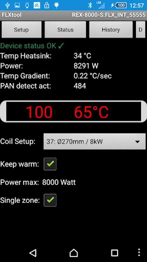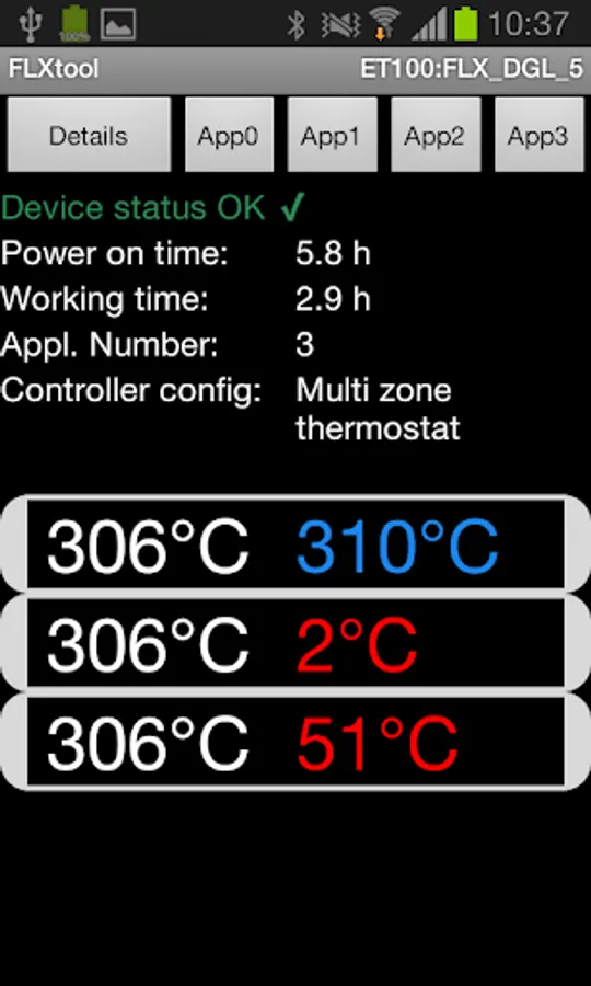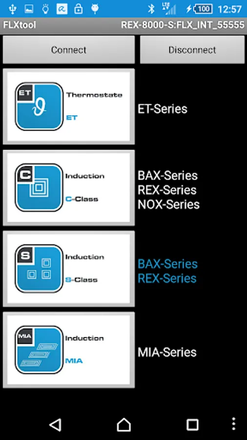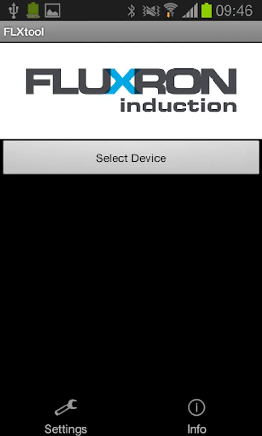 Die Verbindung der App über Bluetooth mit einem Gerät der Firma FLUXRON Solutions AG ermöglicht die Anpassung der Konfiguration und das Auslesen von aktuellen Systeminformationen.