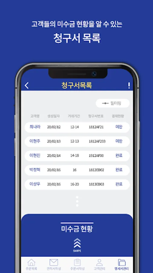 거래명세서를 이용하여 청구서 발행 및 미수관리까지 쉽고 간편하게 휴대폰에서 관리가능한