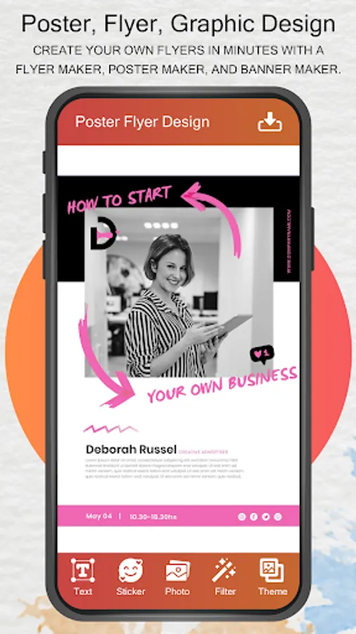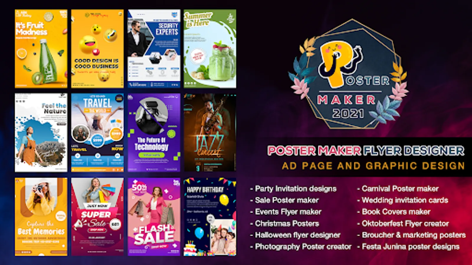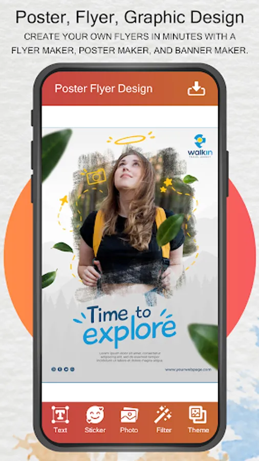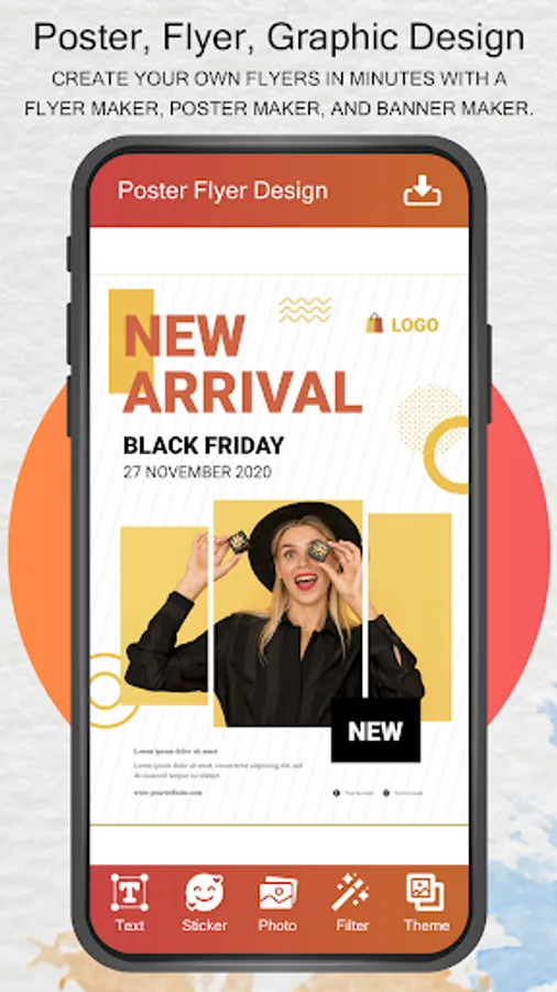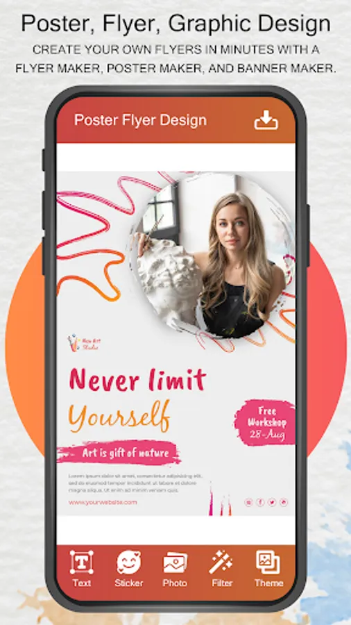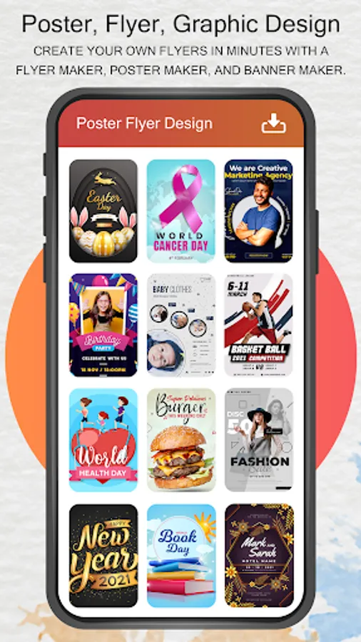 Flyer Poster Maker - Banner Maker with new cool features helps you to design posters, Advertisement banners, ad flyers, invitation cards, happy birthday greetings, music festival posters, motivational quotes, youtube thumbnail images and graphic design for Instagram post and story.