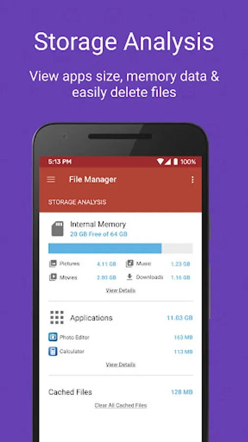 Get a visual breakdown of used storage across apps and file categories (Photos, Downloads, Music, etc.), as well as available storage and cached files