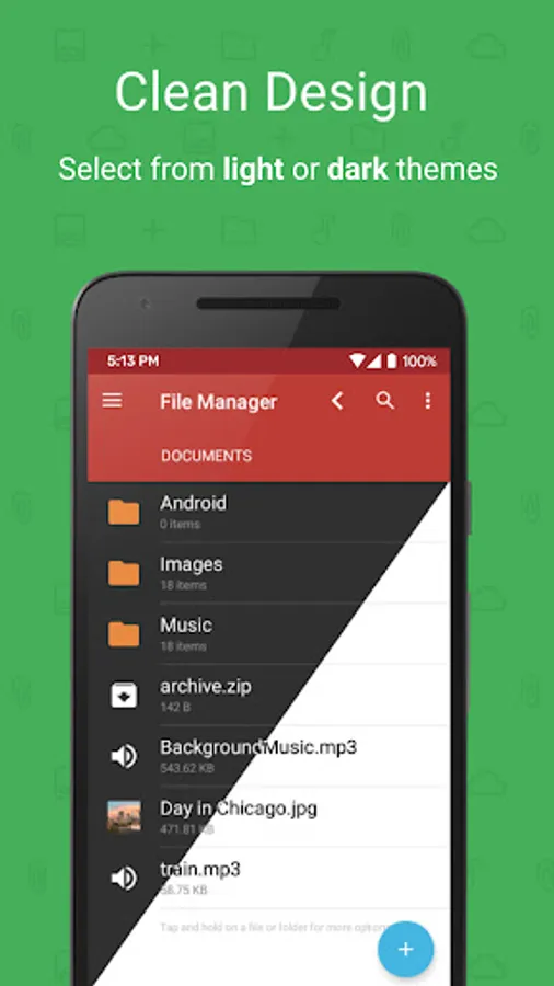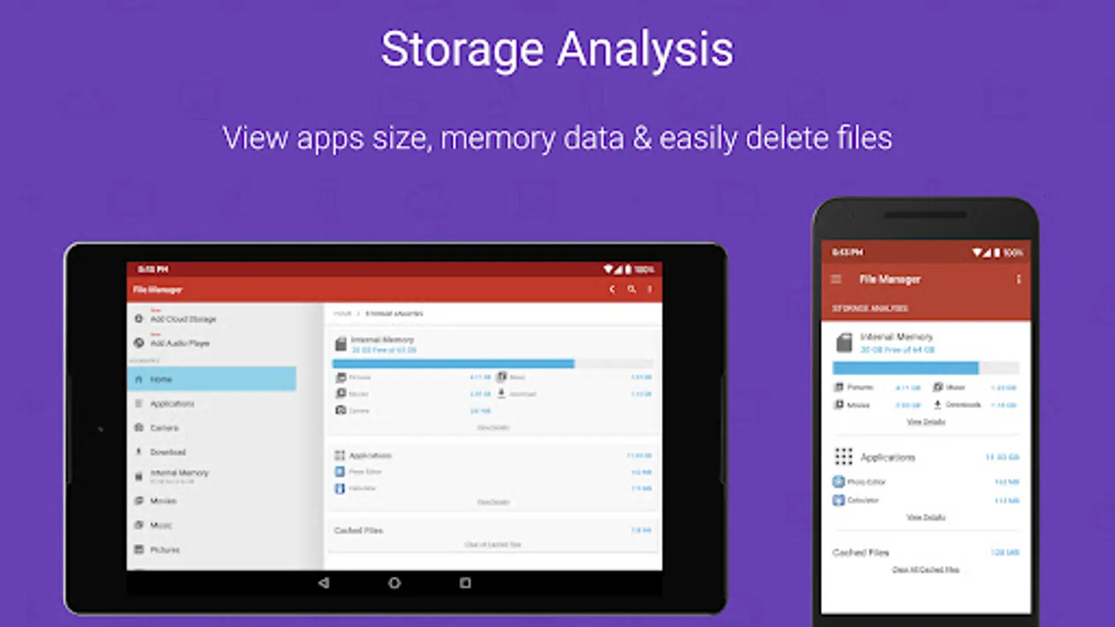 Save space by deleting files with our disk cleaner and extract compressed files or transfer compressed files in ZIP, RAR, APK, TAR, BIN, and TBZ formats. File Manager saves files to USB flash drive (microSD) with on the go (OTG), delete files, share files, and transfer files