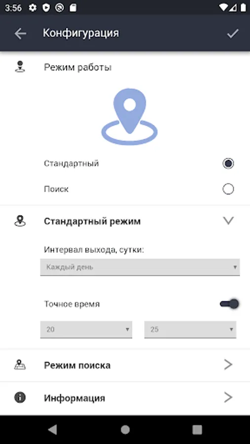 FindMe application has a simple and convenient interface. With it, you can make all the basic settings for the operation of the beacon: enable or disable the search mode, set the interval for transmitting coordinates during the search, set the frequency of communication in the standard mode.