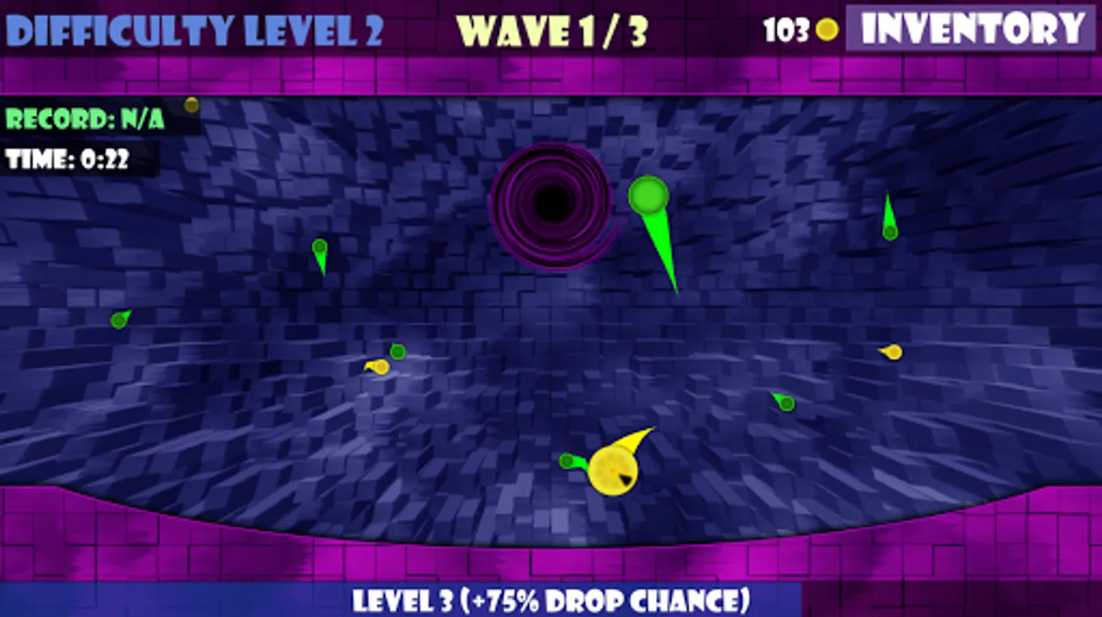To reach a good rank at the highscore of the world you are currently playing in you should switch between aggressive and defensive strategies and try what works best for you. The higher the difficulty level the more galaxy invaders will spawn at the portals and at difficulty levels above 10 the avoidance of collisions will get almost impossible. But there are ways how you can survive those super difficult circumstances: items! Gravity Wars - Clash of Dimensions has an item mechanism that you may now from RPGs. Every invader can drop items in one of three item qualities: