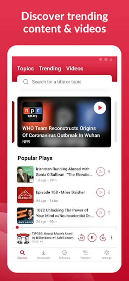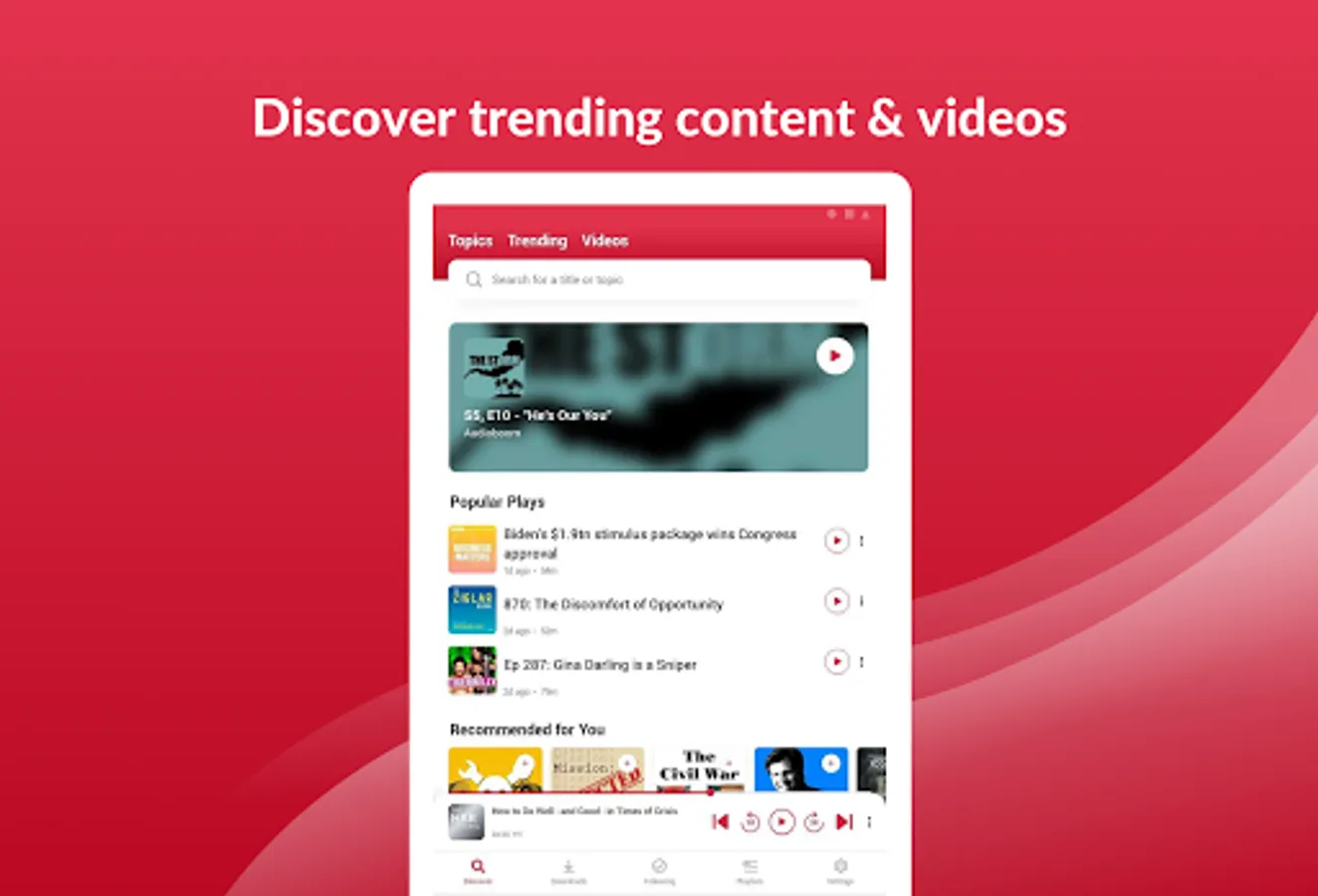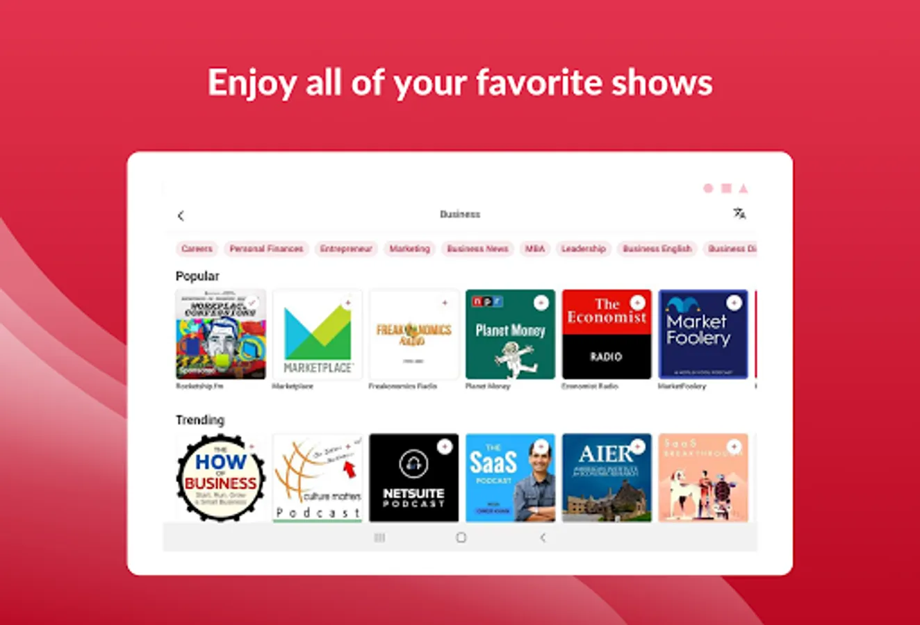 Find your favorite shows and discover trending podcasts focused on education, news, business, technology, sports, comedy, music, and more! Our podcast library is updated multiple times per day, ensuring we always have the latest shows and episodes. Plus, discover free audio books, documentaries, video podcasts and interviews with our human-powered catalogue and advanced episode-level search.