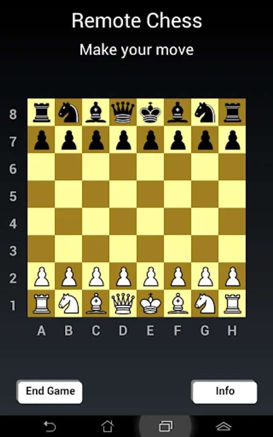 One player will move withe pieces, and will see the chessboard from his white side; the opponent will own black pieces, and will see the chessboard from the opposite side.