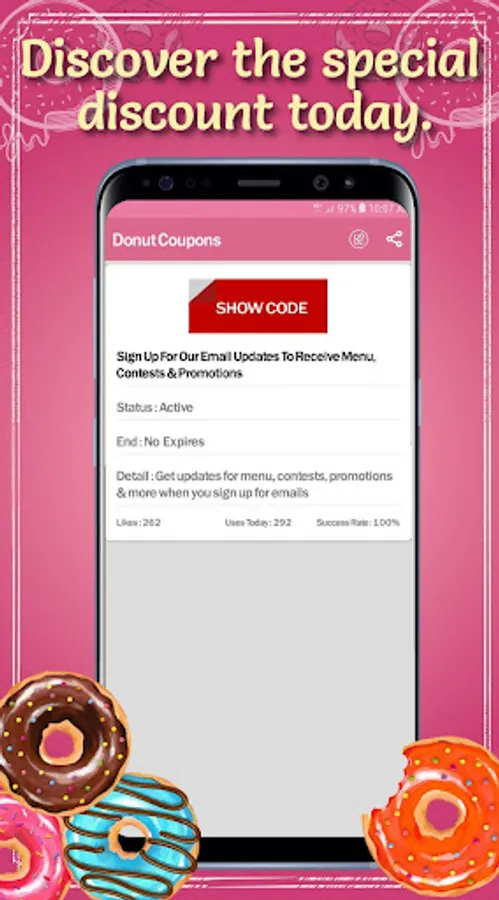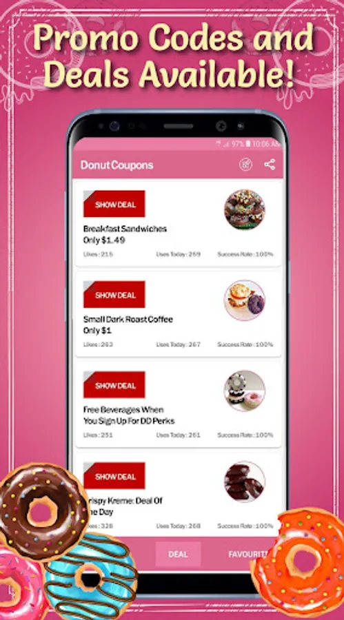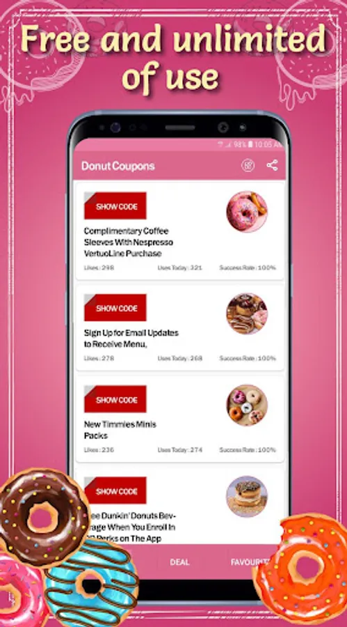 Donut Coupons application is very friendly and easy to use as you can find the deals and coupons, and save the promo and codes for use later or even share to your friends. This Donut Coupons is created by third party and is not related to Tim Hortons, Krispy Kreme, Dunkin' Donuts coupons or to any other company’s promo codes, coupons and deals.