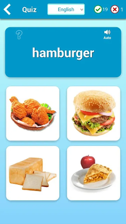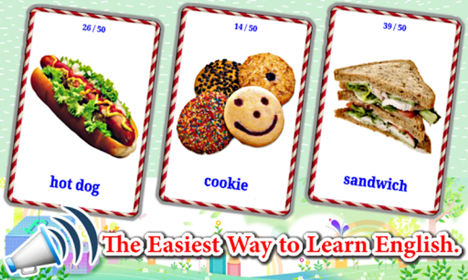 The app provides the best way to get started learning many kinds of foods , which contains many cards , each word card are voice-enabled, and related words and pictures.