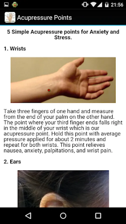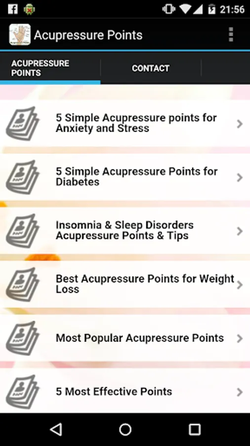 This app provides you all acupressure treatment for all diseases and will shows the information about acupressure points, reflexology points, hand acupressure, leg acupressure and neck acupressure. acupressure points to help you get better when you pain. acupressure is the most effective method for self-treatment of tension-related ailments.