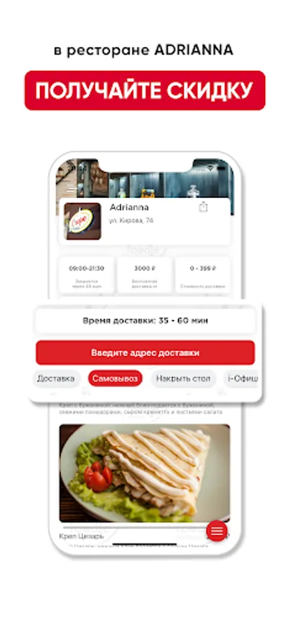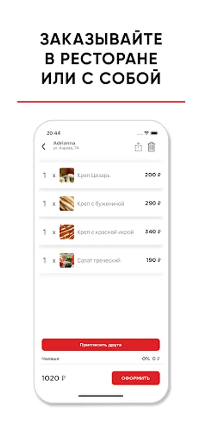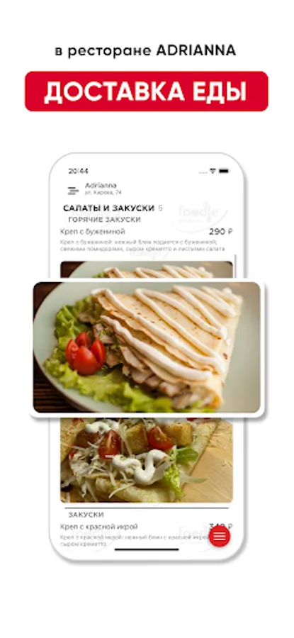 Order with delivery: crepes, pancakes, pizza, sandwiches, desserts, salads, hot snacks, tea, coffee, cocktails, smoothies, fresh juices and drinks.