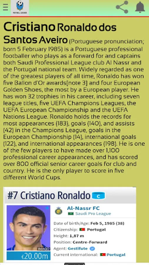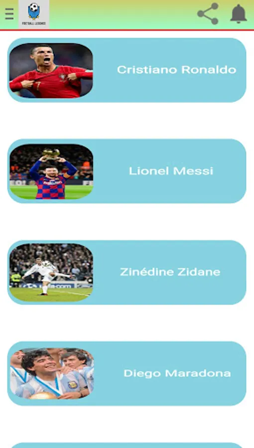 All the wonderful football players of all time in the world. Learn their life stories through this wonderful and colorful app. We've worked hard and created a beautiful app just for you. In this application you will find the best football players like Lionel Messi, Pelé, Cristiano Ronaldo, Maradona, Maldini, Cafu, Luis Figo, George Best, Rivaldo, Gheorghe Hagi, Luis Suarez, Dennis Bergkamp, Fabio Cannavaro, Oliver Kahn , Pavel Nedved, Zlatan Ibrahimoviç, David Beckham, Wayne Rooney, Frank Lampard, Luka Modric, Ryan Gigs, Eden Hazard, Sergen Yalçın, Thierry Henry, Javier Zanetti, Marco van Basten, Roberto Carlos, Ian Rush, Ferenc Puskás, Franco Baresi, Franz Beckenbauer, Johan Cruyff, Zinedine Zidane.