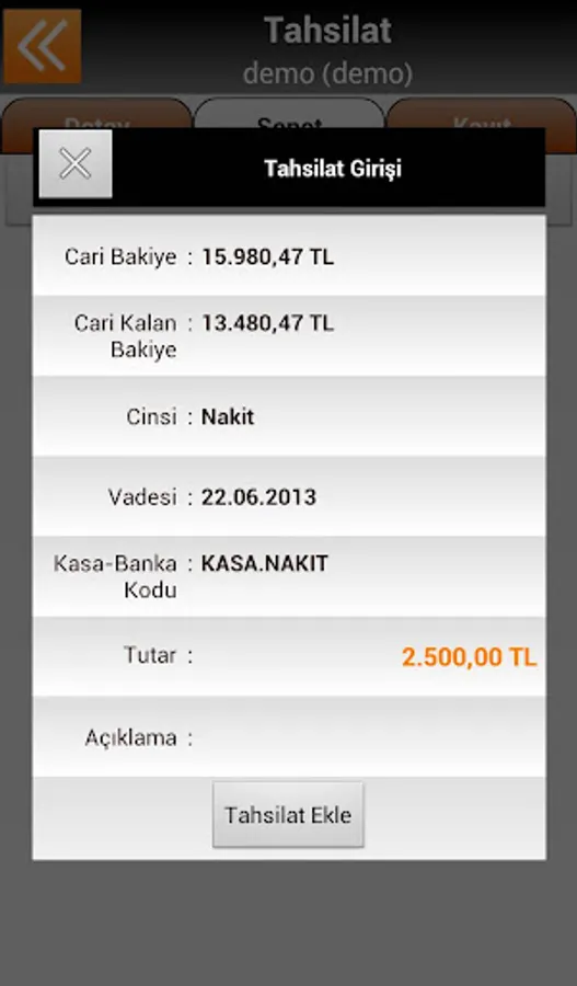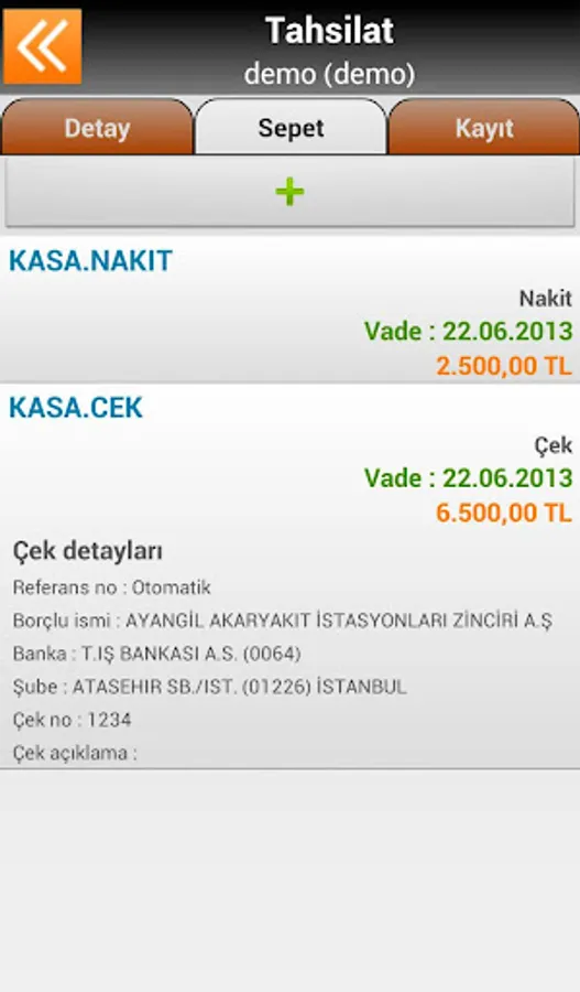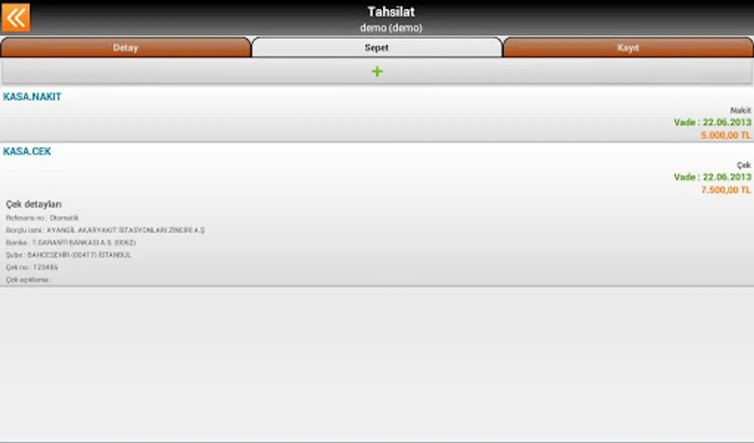 Collection entries can be made in cash, check, promissory notes and credit card types. While making check collection, check number, debtor information and bank information (by selecting banks and branches in the micro database) can be entered.