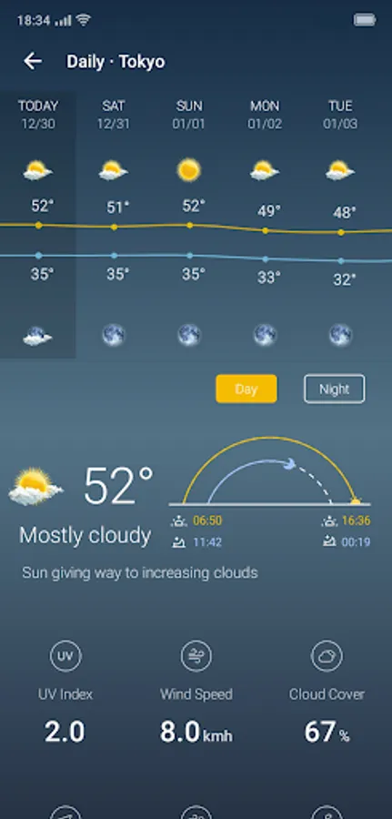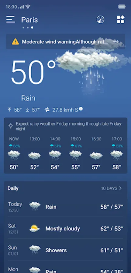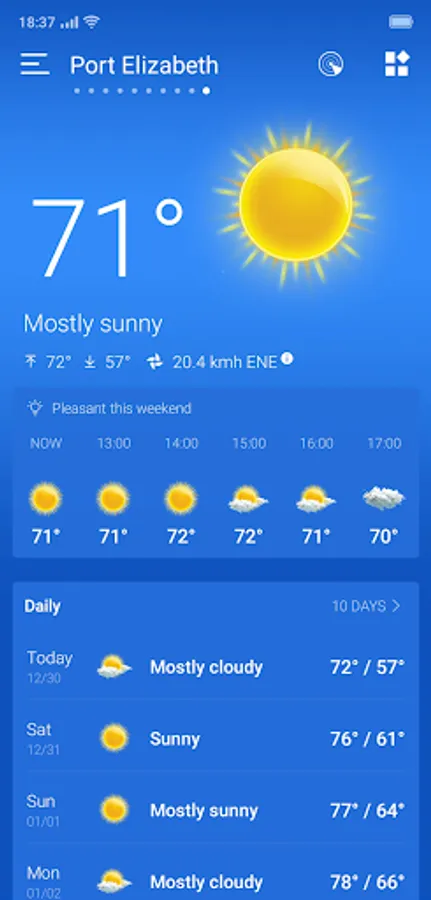 - Specific information: max and min temperature, weather status, air quality, sunrise and sunset time, UV index, and radar