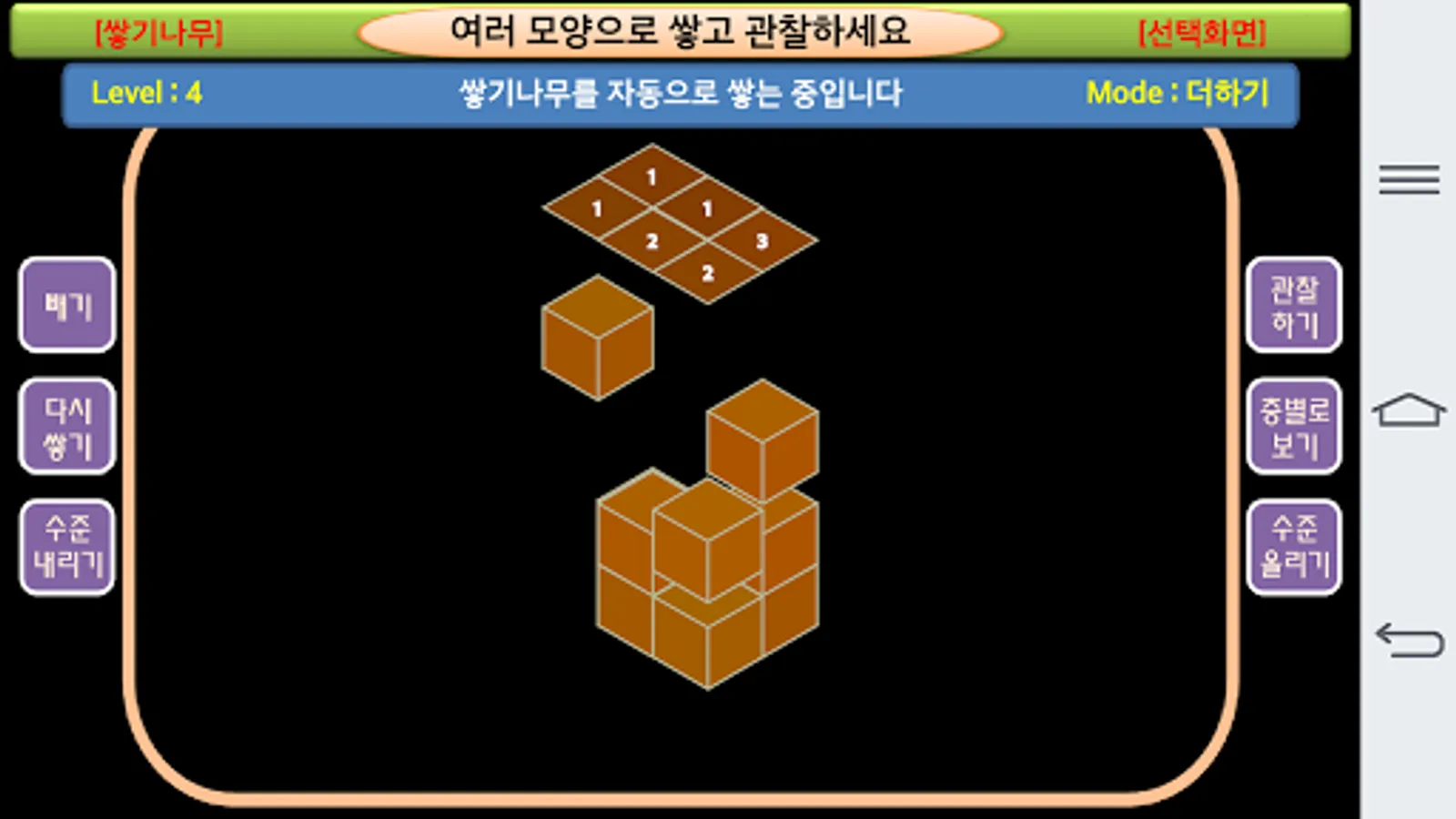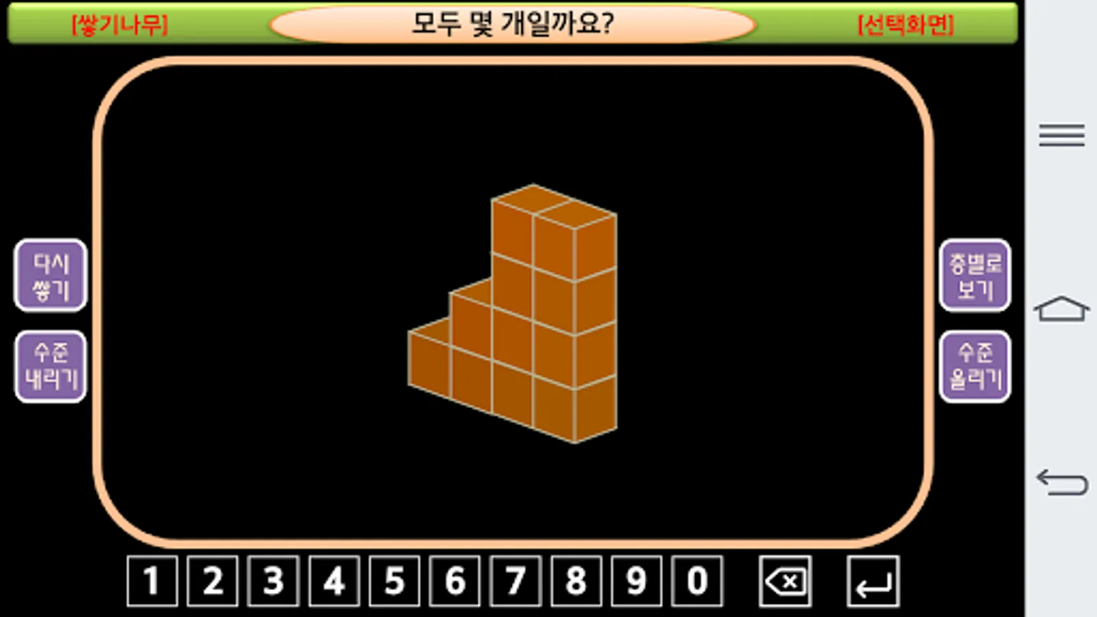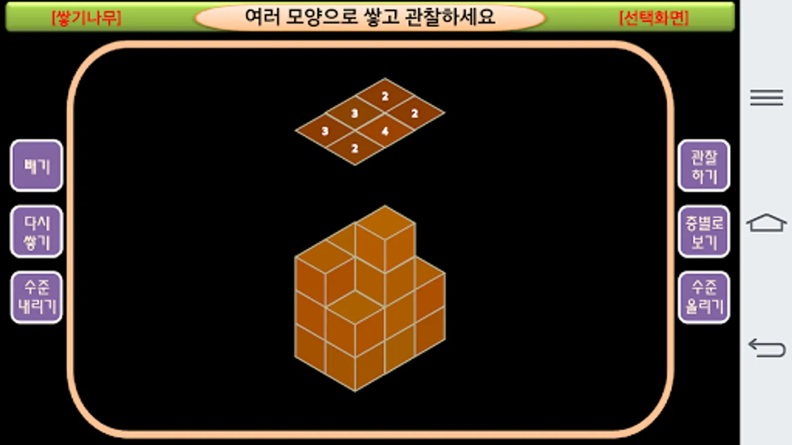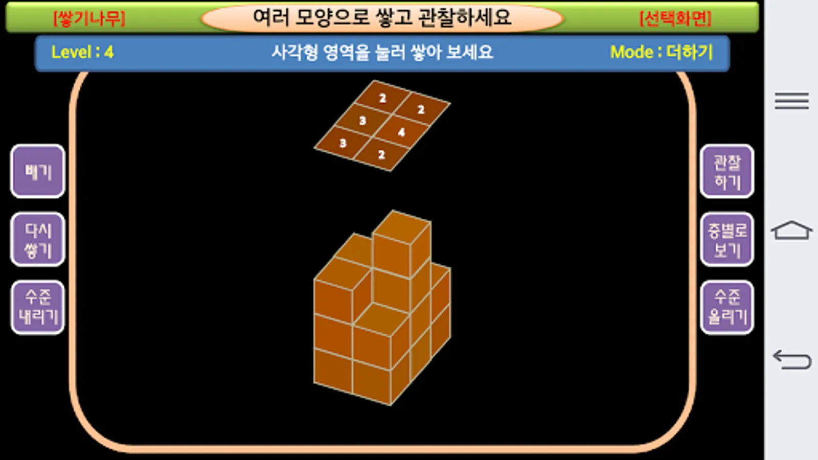 초등학교 수학과에 나오는 쌓기나무 관련 내용 관련 교수-학습을 지원하기 위한 어플입니다. 물론 정규 수업과 관계없이 어린이들이 활용하면 유익할 것으로 보고 있습니다. 유사한 어플들이 있습니다만, 본 어플은 수학과 교수학습을 감안하였고, 좀 더 다양한 상황에서 적용이 가능하도록 하였으며, 입체도형을 다양하게 학습할 수 있는 부분을 포함하였습니다.