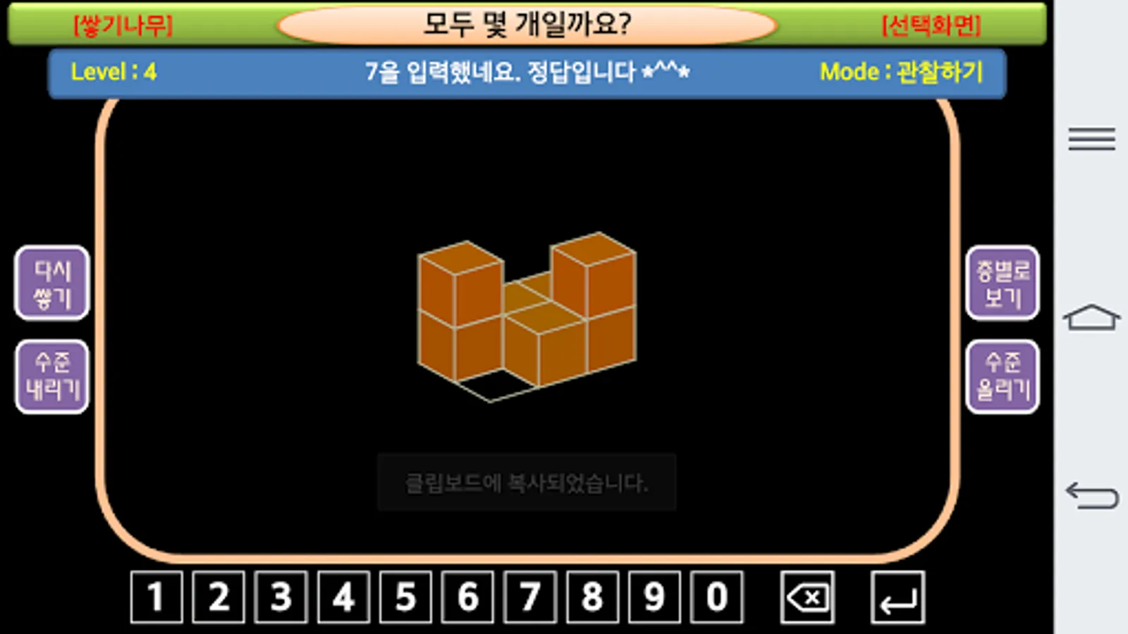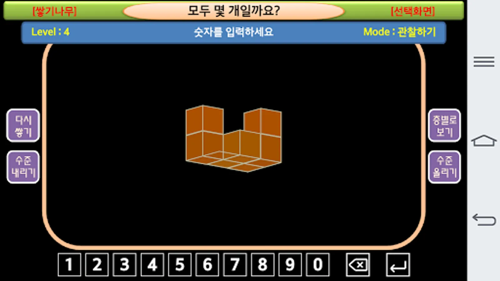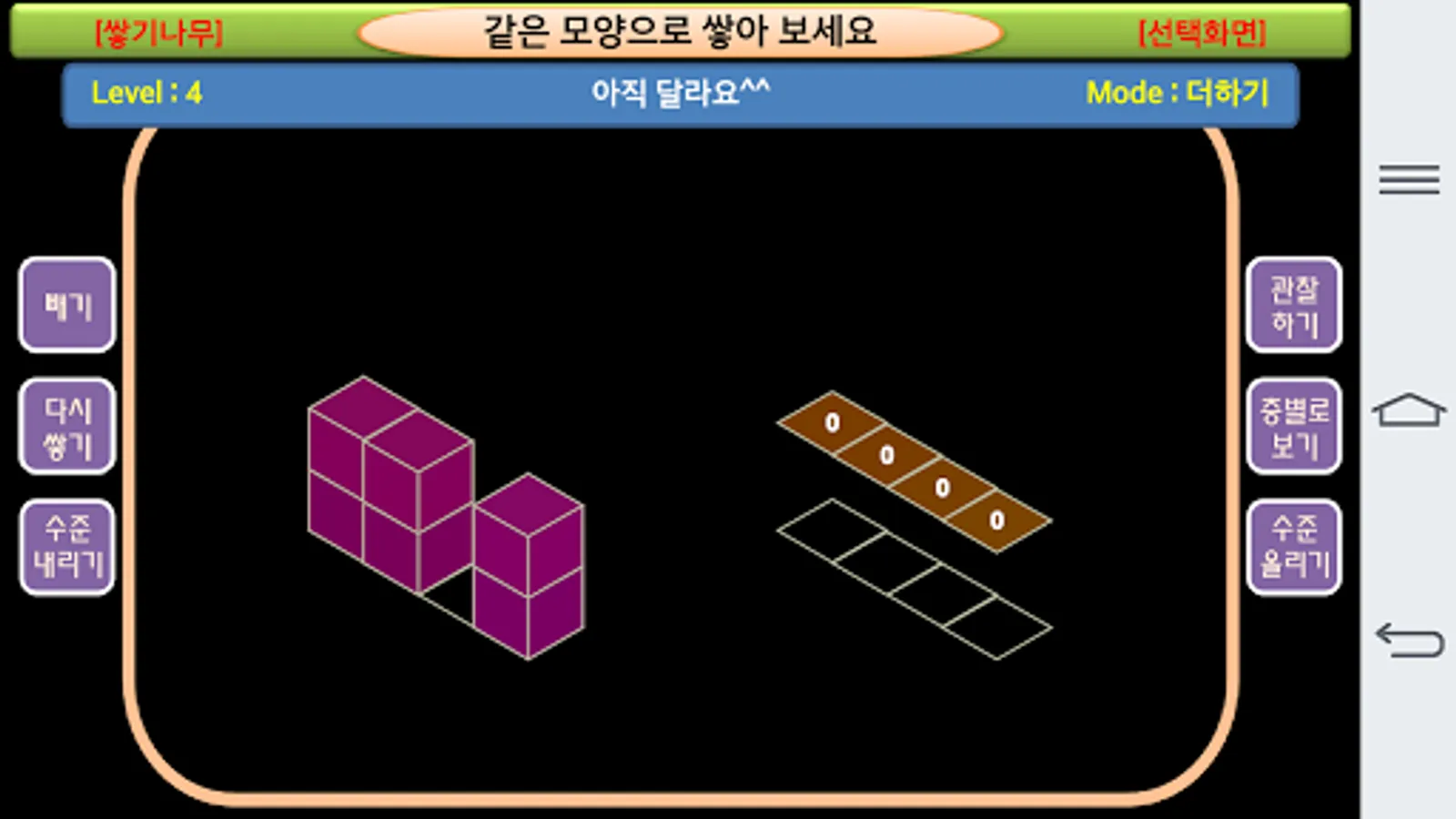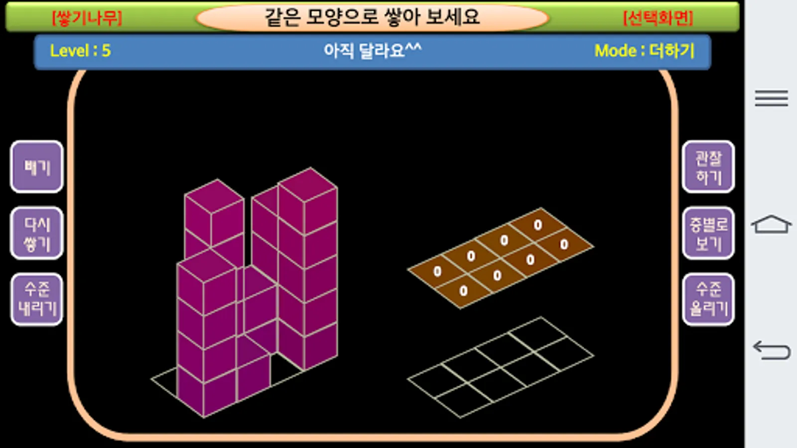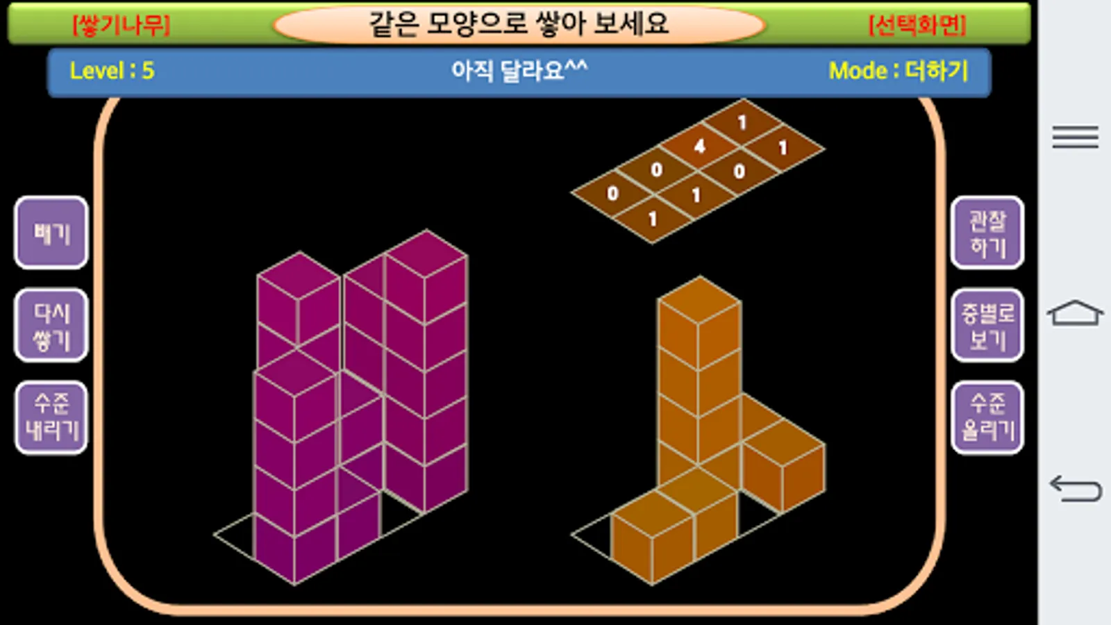 초등학교 수학과에 나오는 쌓기나무 관련 내용 관련 교수-학습을 지원하기 위한 어플입니다. 물론 정규 수업과 관계없이 어린이들이 활용하면 유익할 것으로 보고 있습니다. 유사한 어플들이 있습니다만, 본 어플은 수학과 교수학습을 감안하였고, 좀 더 다양한 상황에서 적용이 가능하도록 하였으며, 입체도형을 다양하게 학습할 수 있는 부분을 포함하였습니다.