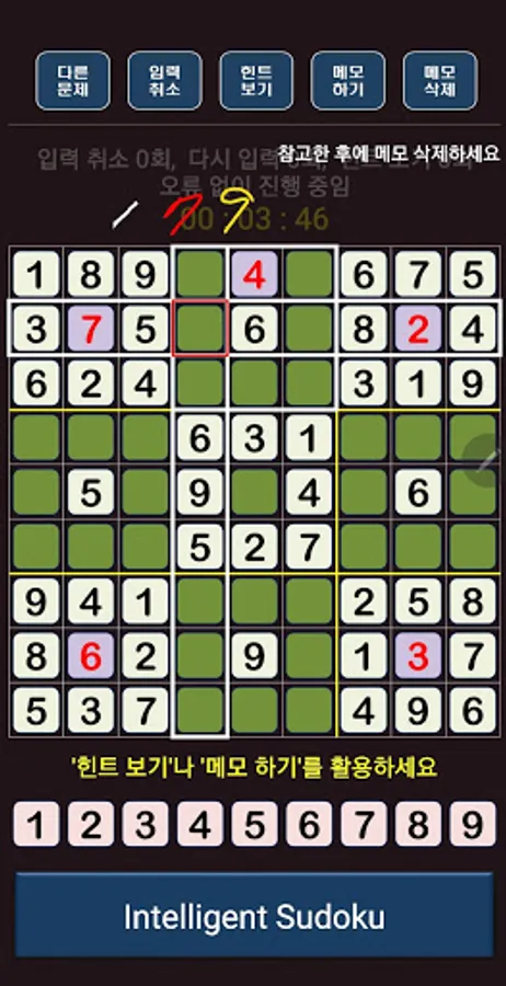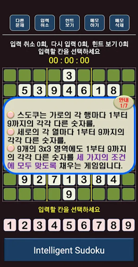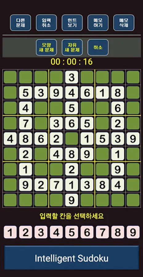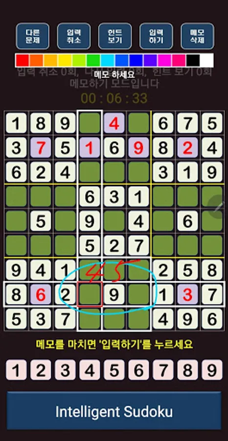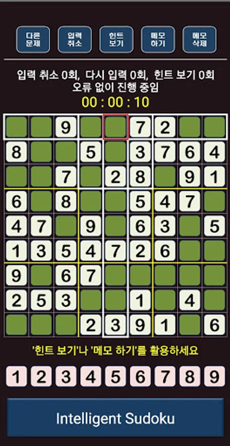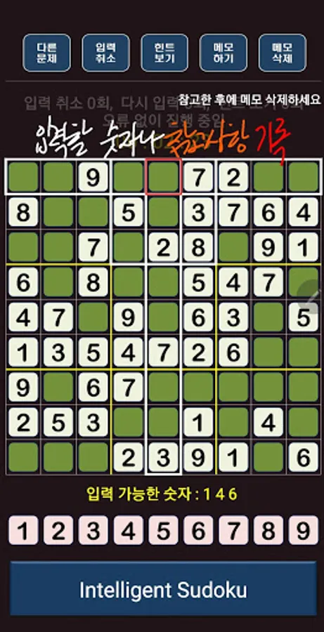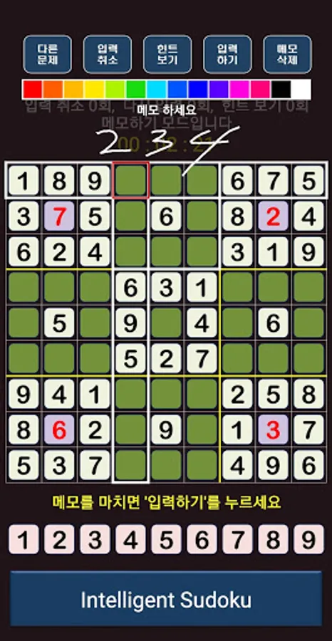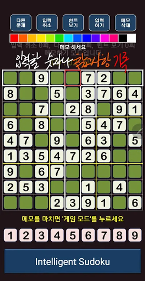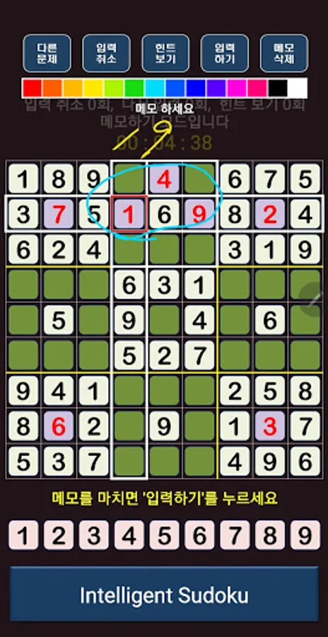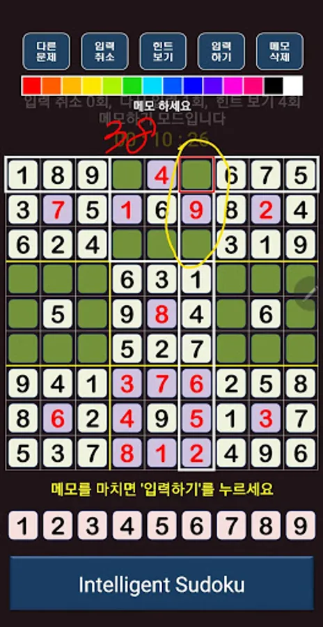 2. 입력할 칸을 먼저 선택하고, 화면 아래에 있는 1부터 9까지의 숫자 중에서 선택하시면 됩니다.