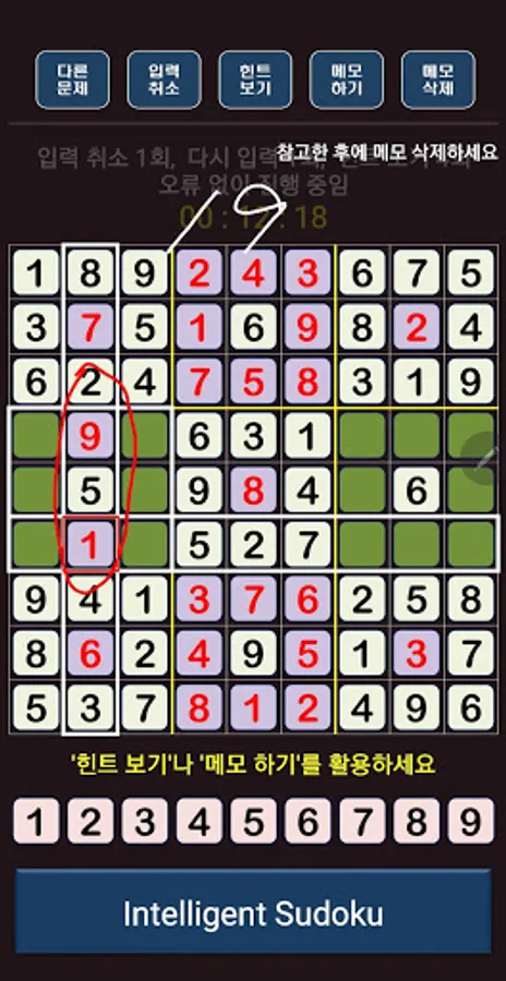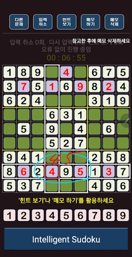 9. 메모 하기 버튼은 문제를 푸는데 참고할 내용을 적어 두는 기능입니다. 잘 활용하면 다양하게 생각하는데 도움이 될 것입니다. 메모 모드에서는 숫자를 입력할 수 없으므로, 입력 하기 버튼을 먼저 눌러야 합니다. 메모 삭제 버튼으로 입력에 참고하기 위해서 메모한 내용을 한 번에 모두 삭제할 수 있습니다. 메모한 것을 참고하여 숫자를 입력한 후에 사용하시면 됩니다.