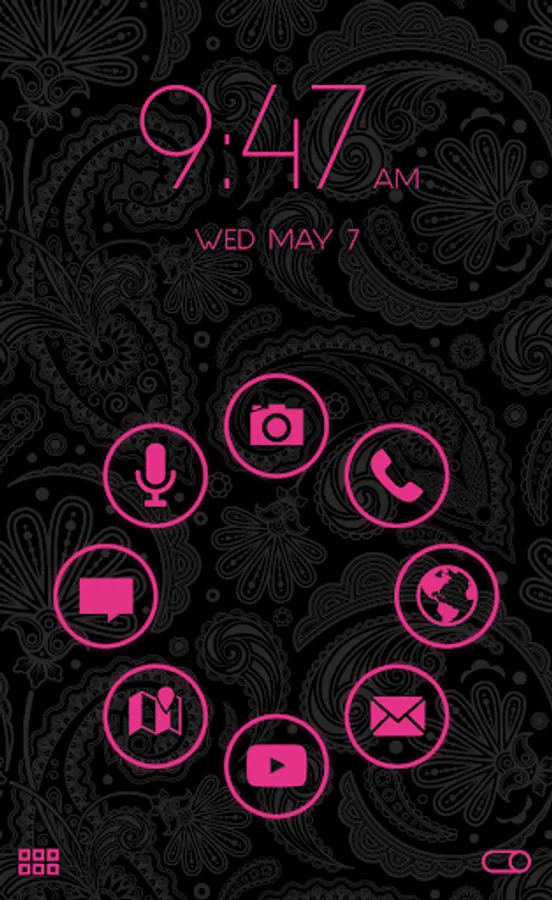 This modern bold Smart Launcher Theme is designed for use with all types of background wallpapers. This theme also includes a matching Analog Clock Widget!