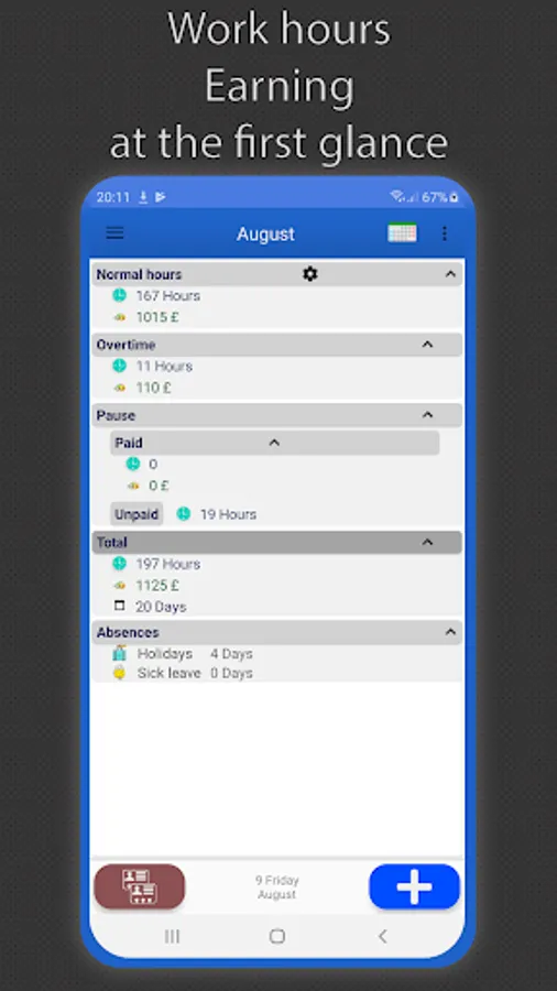 With the calendar inside you can enter, edit and observe the intervals of your working hours for each month by consulting the details divided by hours and earnings: