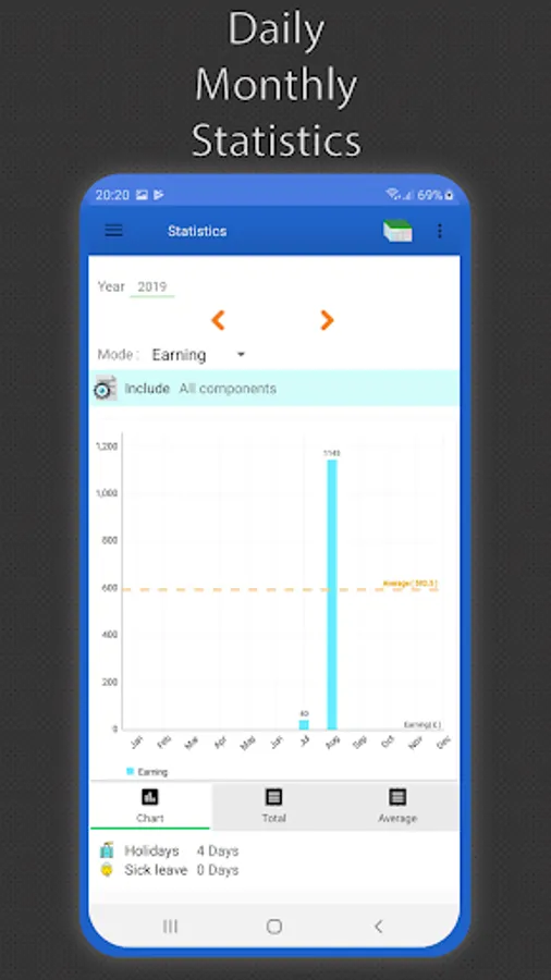 You can see your earnings or your annual hours (month by month) and monthly (day by day) through the graph. The events components can be configurate at will!