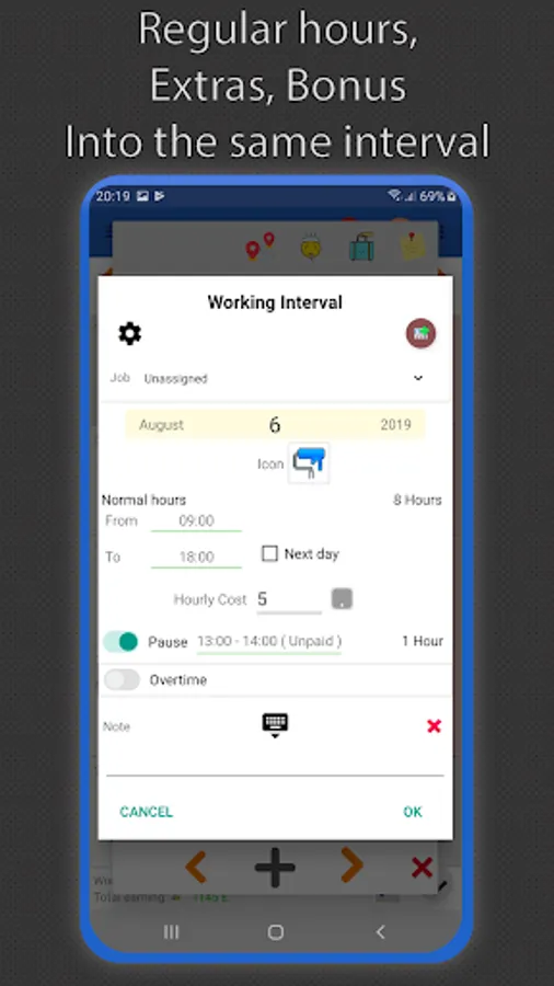 Paid/Unpaid indicator: With the Paid/Unpaid indicator you can track your paid or unpaid working hours. Never forget again any payment !