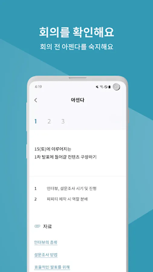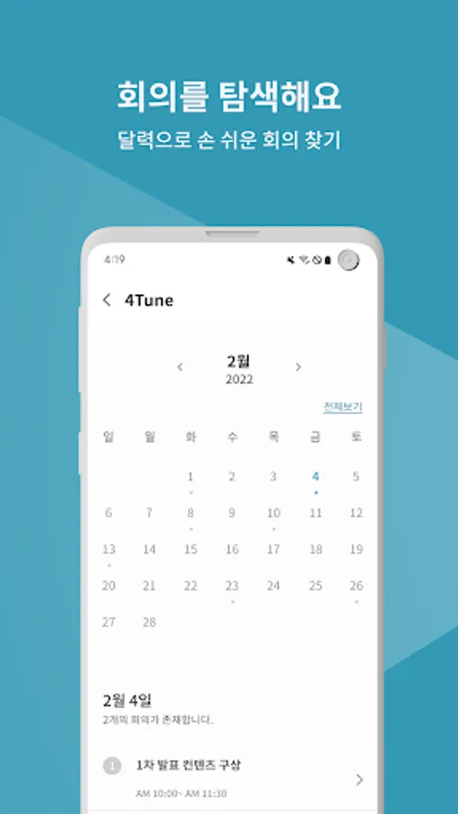 A given meeting at a glance. Check the meeting schedule and prepare with the calendar and meeting card.