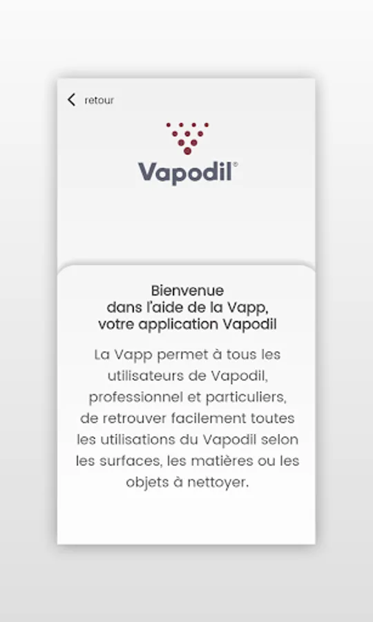 Vapp is the customizable assistant dedicated to professional or individual users of the Vapodil solution. It offers immediate support for cleaning by offering for each specific situation the best Vapodil use technique.