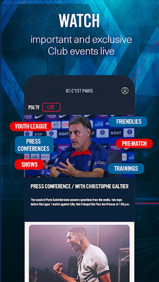 Watch important Club events live and exclusively on PSG TV: all trainings, press conferences, pre-matches, TV shows and sometimes friendlies* and Youth League matches (*depending on TV rights).