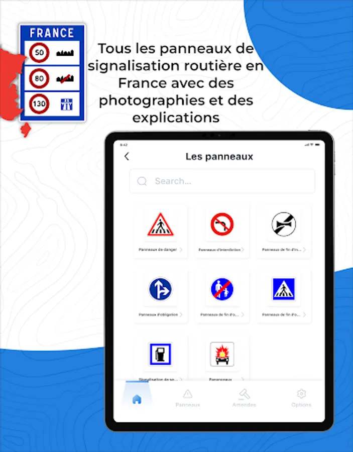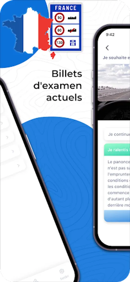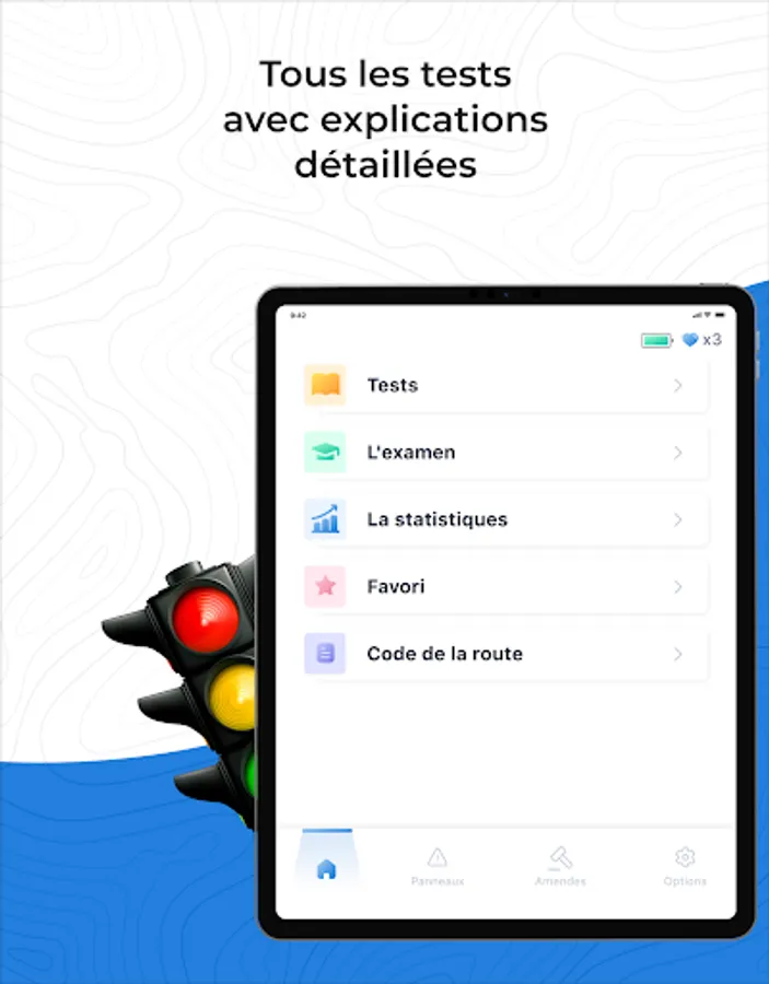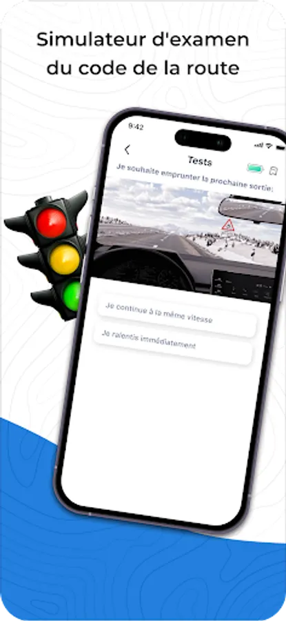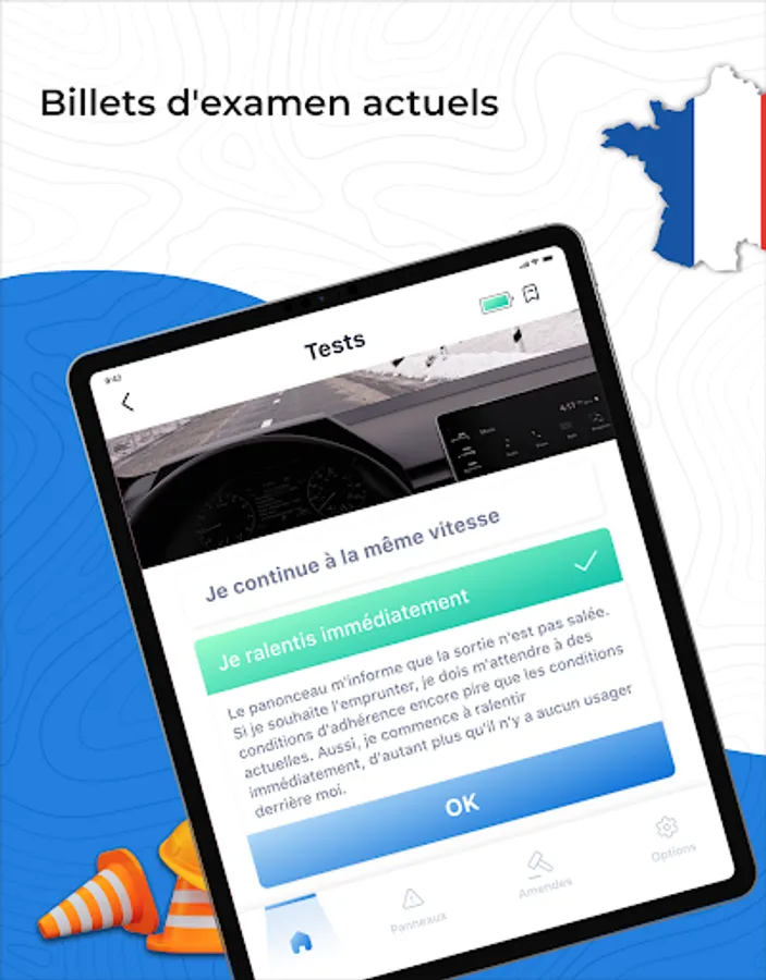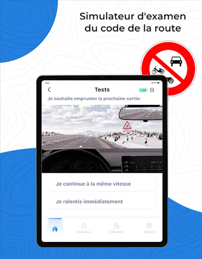 Learning: the application offers a complete set of current tests for learning the highway code. Users will be able to learn various aspects of road safety including signs, markings, priorities, turns, speed limits and more.
