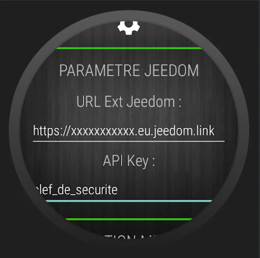 Thanks to this application you will be able to control your jeedom quickly with a simple gesture. All you have to do is enter your remote URL address of your jeedom installation and your security key (API key). Then you can add the equipment quickly by typing their name and the "id" number of the Jeedom equipment (eqLogic_id). Thanks to the generic info/action type of your equipment, the object is automatically created on your watch.