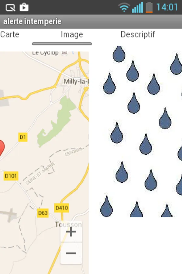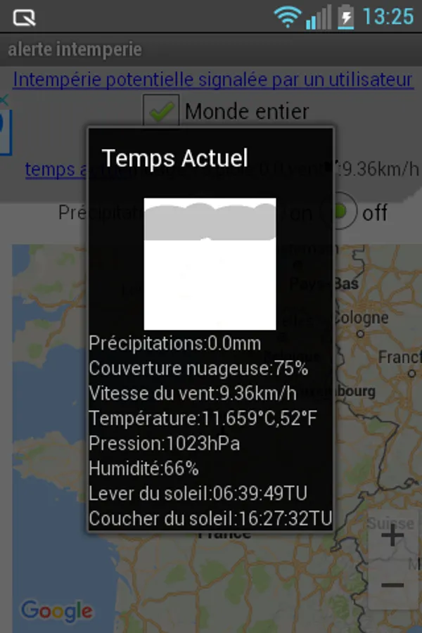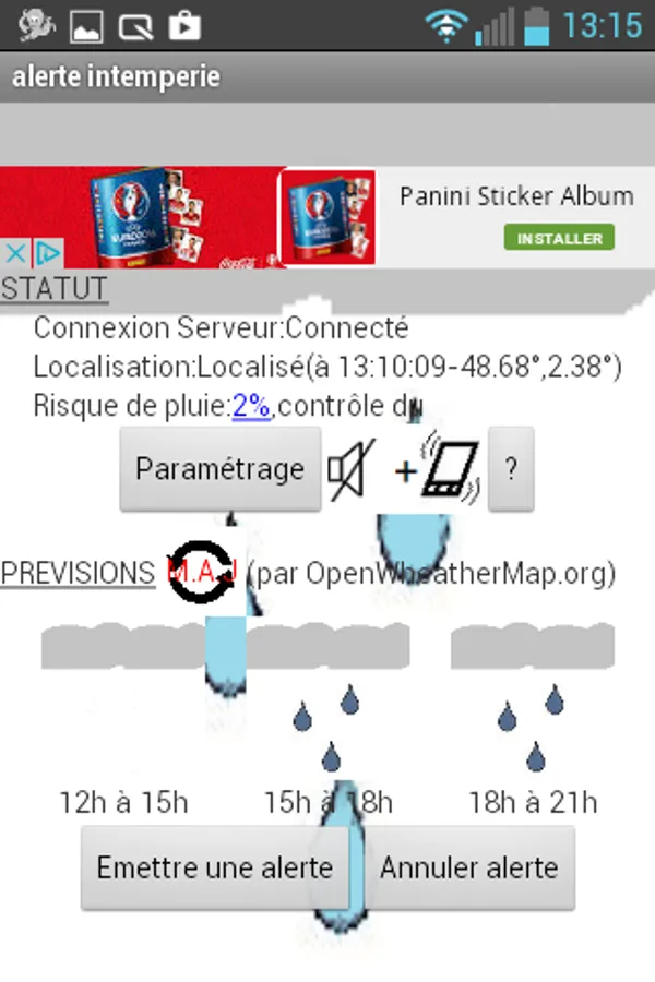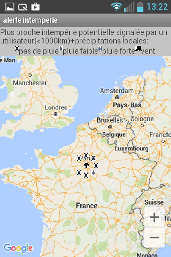 All users of the application can broadcast weather alerts and thus prevent people rain or hail comes. Indeed, if you're in the rain, you can send an alert: all users mainly in your area, within their scope of notification will almost instantly notified by email alarm. You can accompany warning message / comment and the photo of the weather.