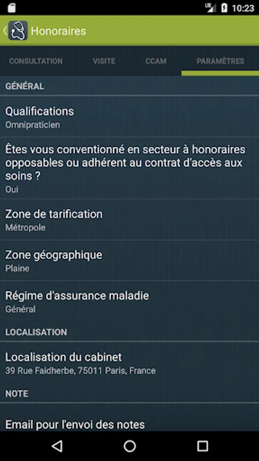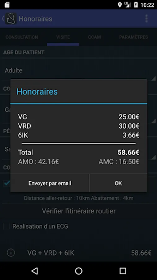 - Presentation of the fee note with different codes, their respective price AMO / AMC shares (general scheme or Alsace-Moselle). Send note by email to a configurable default address to account for acts back to the office.